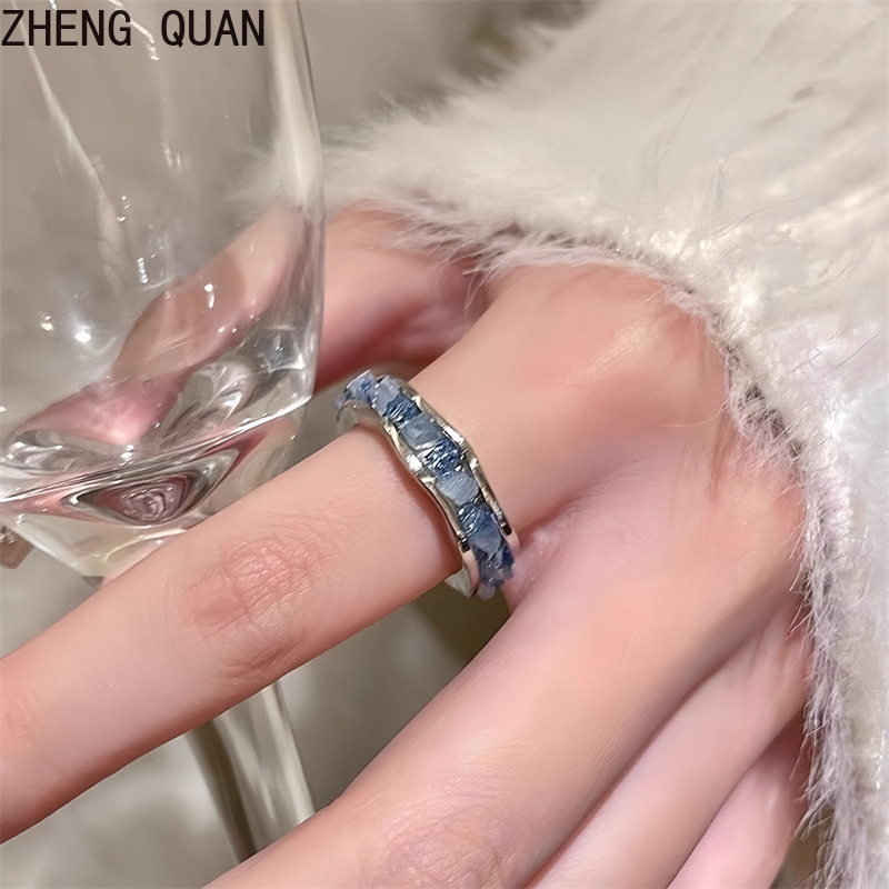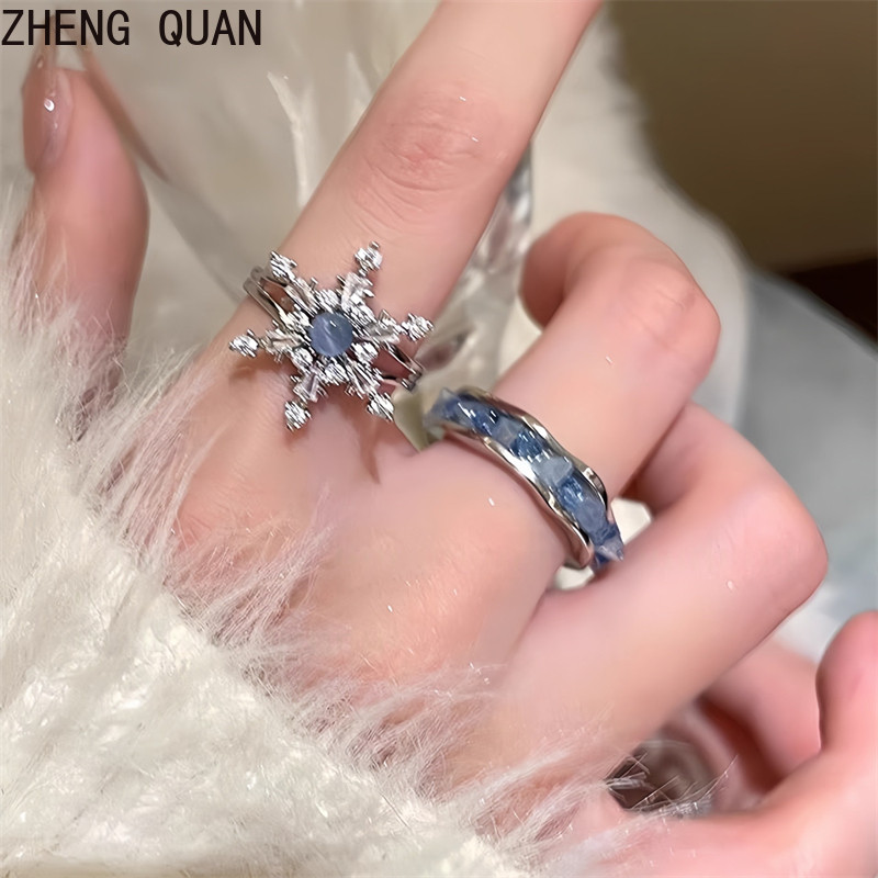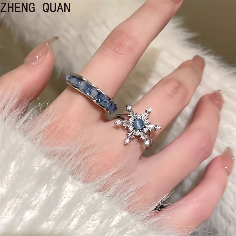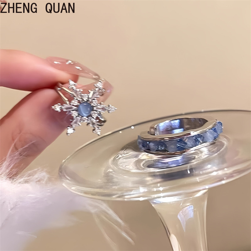 แหวนเพชรสีฟ้าคริสตัลแบบเกล็ดหิมะสำหรับผู้หญิง ประกายระยิบระยับในโทนเงิน เป็นของขวัญวันพิเศษที่สวยงาม