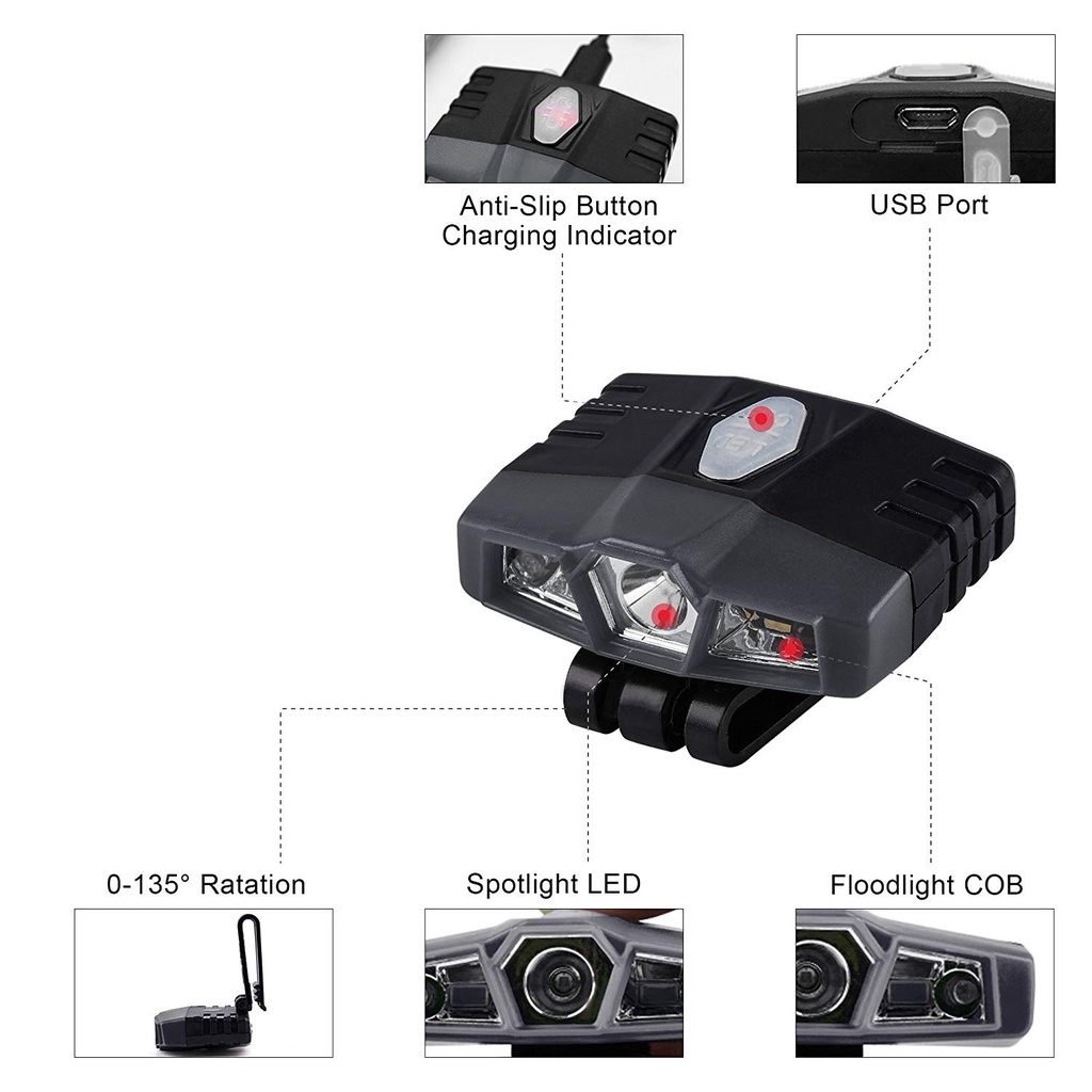 ไฟฉายติดหมวก กันน้ำ แบบชาร์จไฟ 150 Lumens