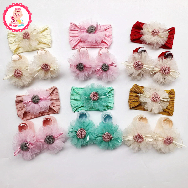 ที่คาดผมและถุงเท้าลายดอกไม้ฟู สีสันสดใส สำหรับเด็กผู้หญิงวัยแรกเกิด