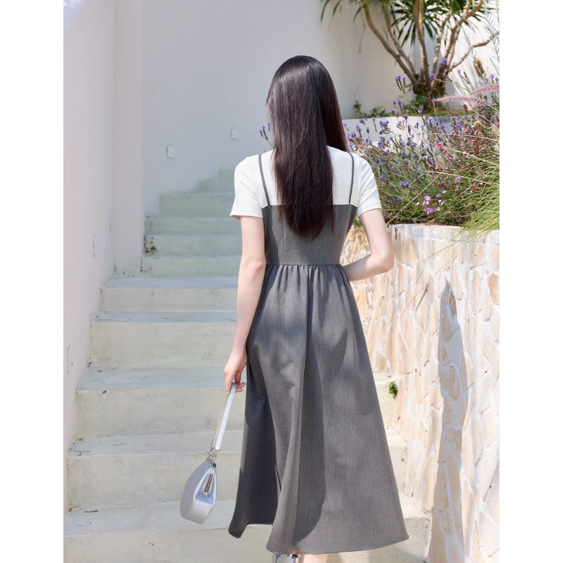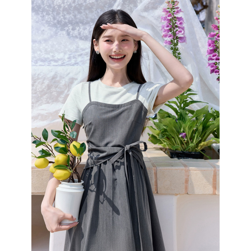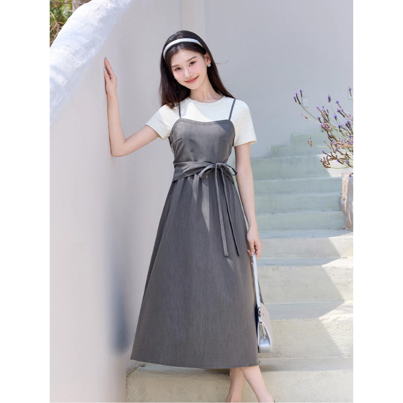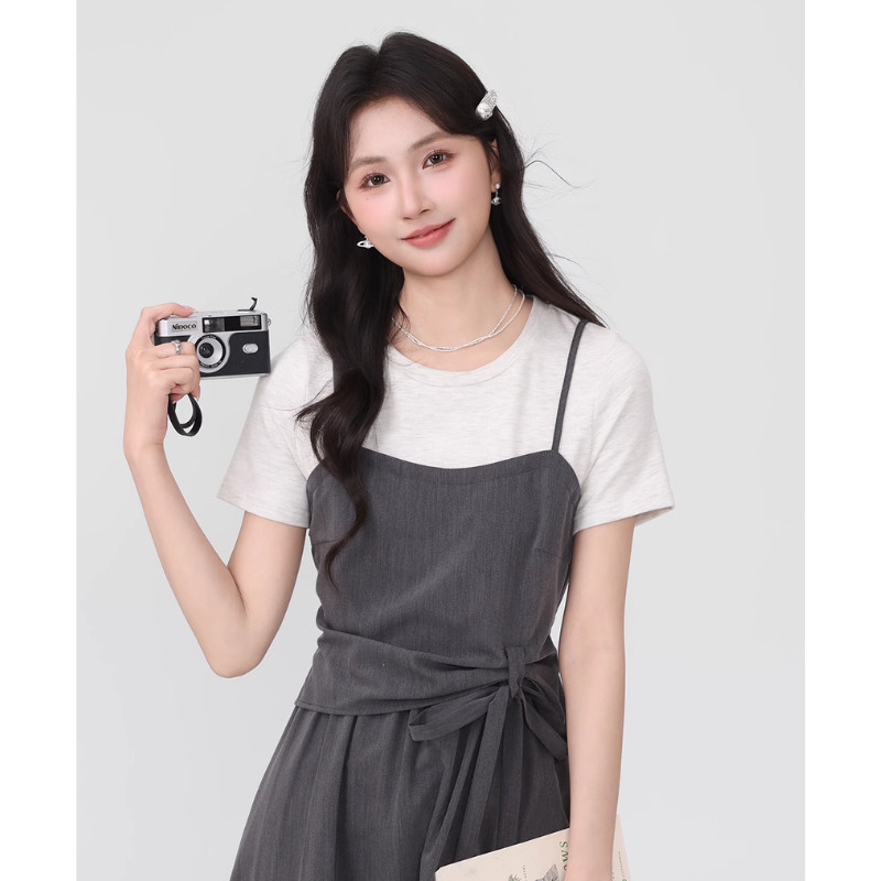 【EVIOVIO】 S-2XL เดรสยาว เสื้อยืด สายเดี่ยวสีเทาเข้ม ดีไซน์ผูกเอว ทรงยาว A-line สไตล์มินิมอลเกาหลี ✨