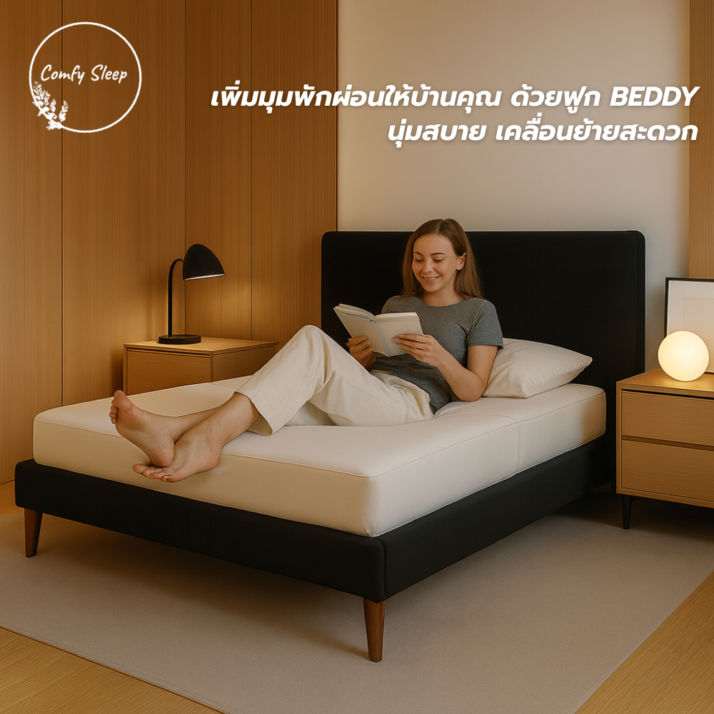 Comfy ฟูกที่นอนใยอัดแน่น รุ่น BEDDY หนา 4 นิ้ว พับ 2 ท่อน น้ำหนักเบา รองรับสรีระขณะนอนหลับ พับเก็บง่าย เคลื่อนย้ายสะดวก เหมาะสำหรับห้องพักขนาดเล็ก คอนโด หรือบ้านที่ต้องการฟูกเสริมสำหรับแขก