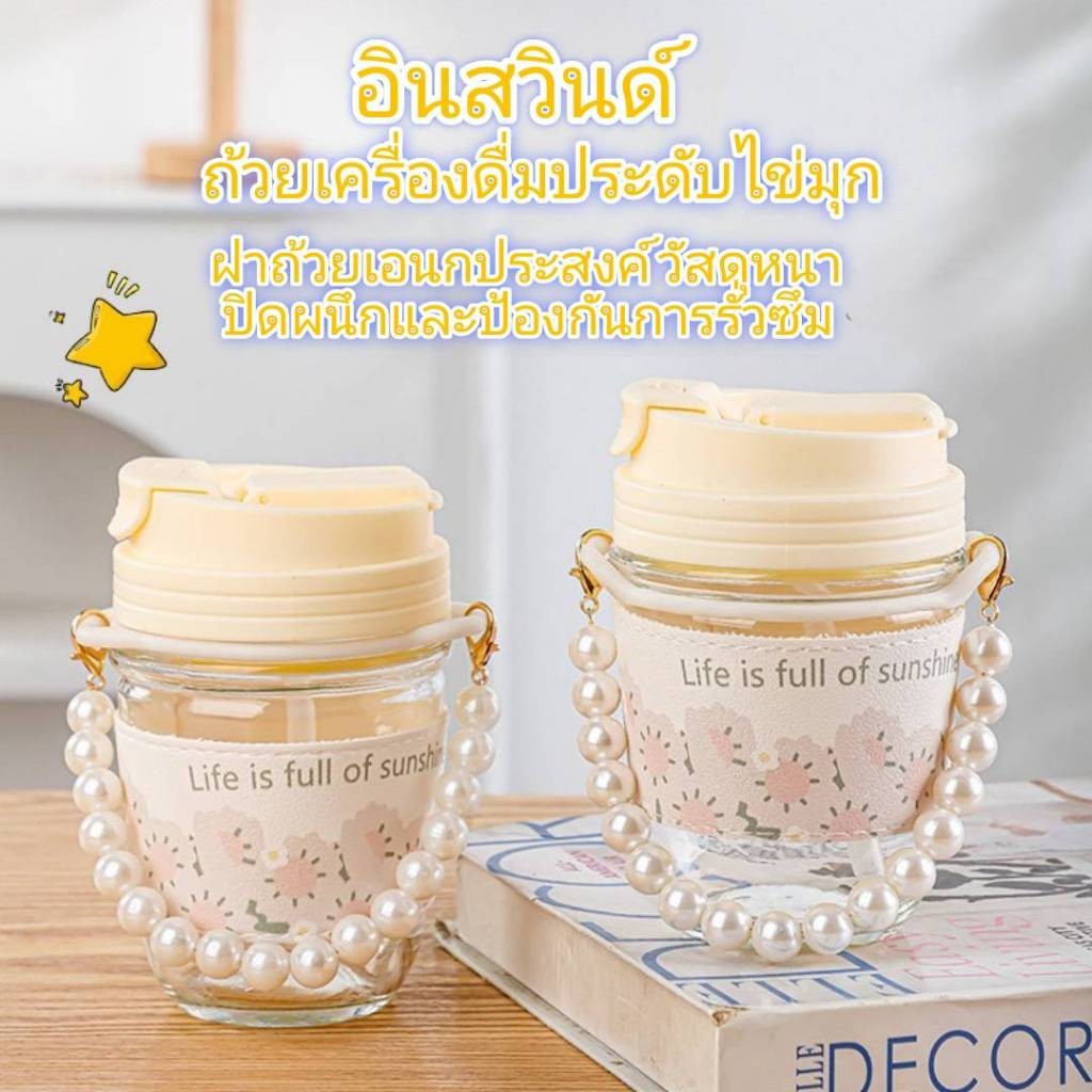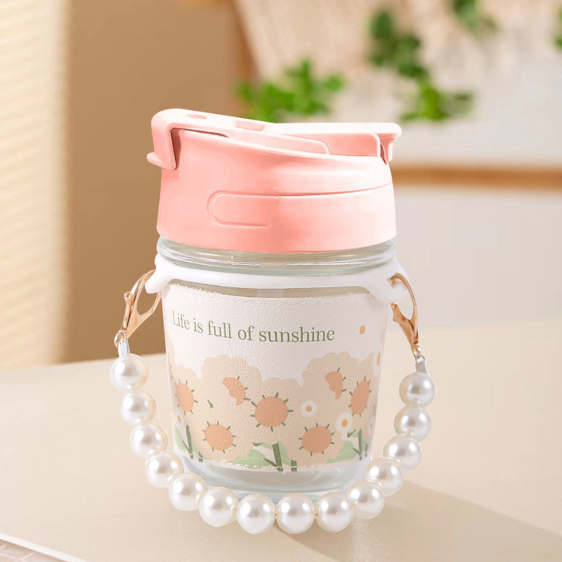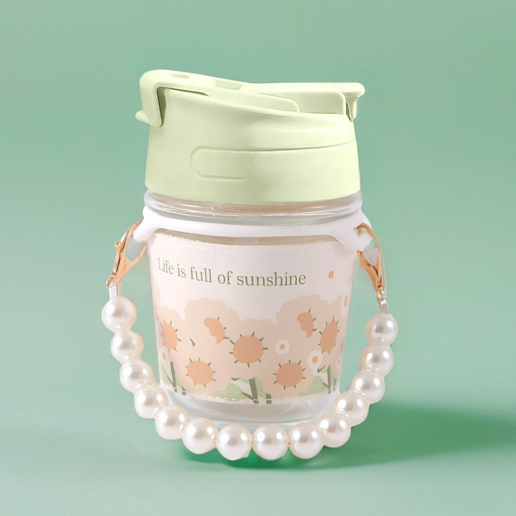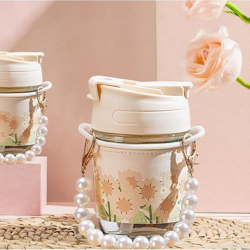 (สินค้าพร้อมส่งจากไทย) ขวดแก้วพร้อมสายไข่มุก สวยเก๋ ตัวแก้วลายดอกไม้น่ารักมาก ขนาด 350 ml? แก้วน้ำ?