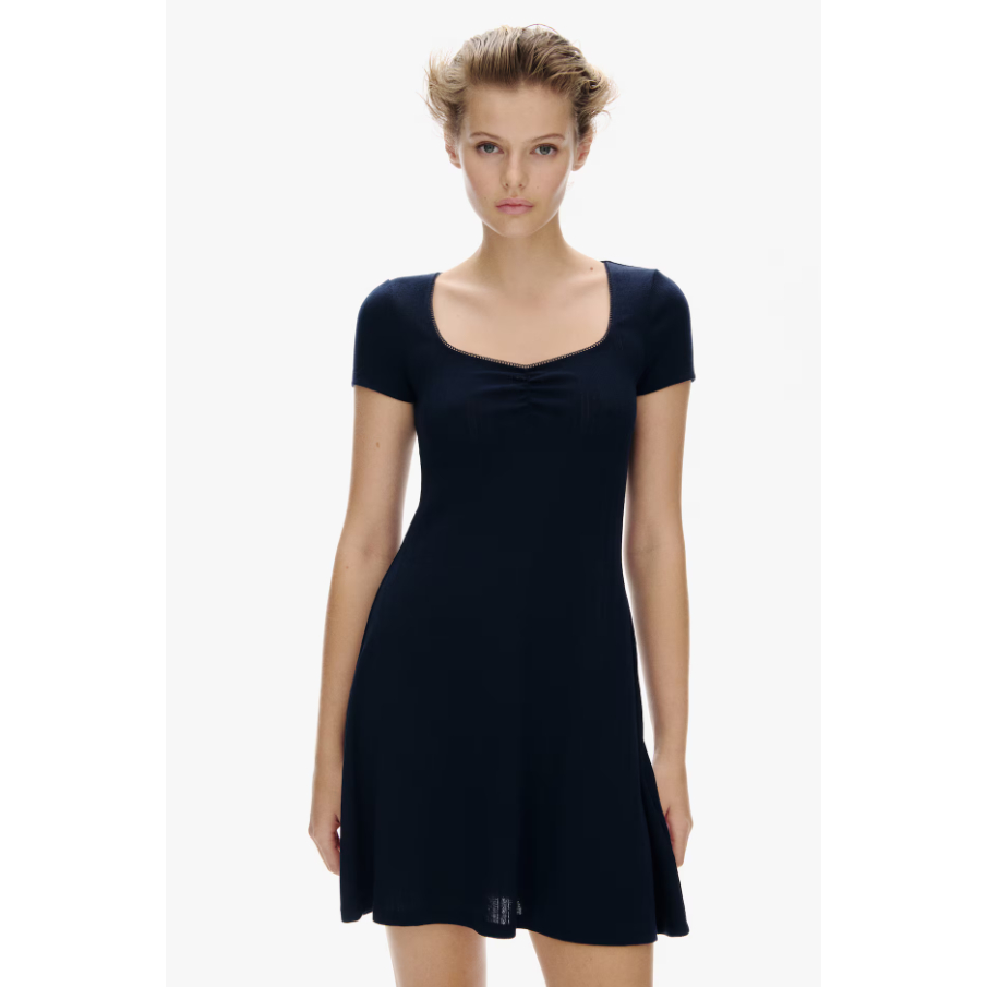 เดรสสั้นในผ้าจอร์ซีย์แบบ pointelle โดดเด่นด้วยคอเสื้อทรงสี่เหลี่ยมพร้อมขอบ picot ที่ละเอียดอ่อน ตัวเสื้อแนบแน่น มีตะเข็บจับจีบตรงกลางอก แขนสั้น และกระโปรงทรงบานเล็กน้อยอย่างอ่อนโยน