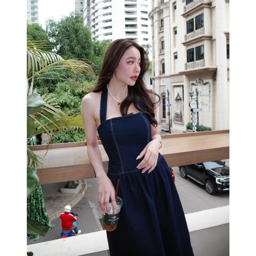 MOTTOM – LINA Denim Halter Midi Dress in Indigo Blue