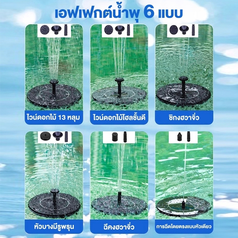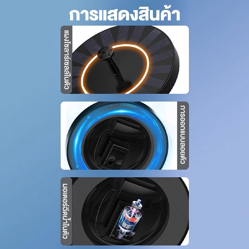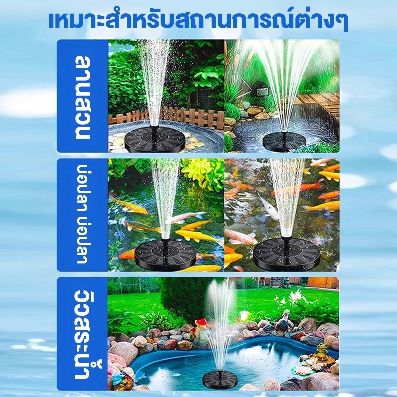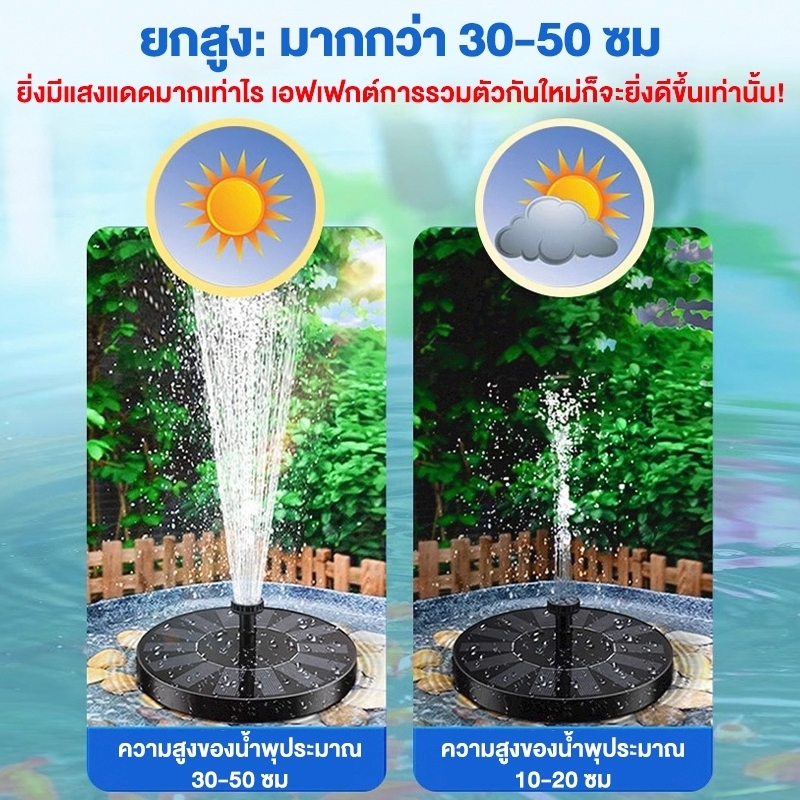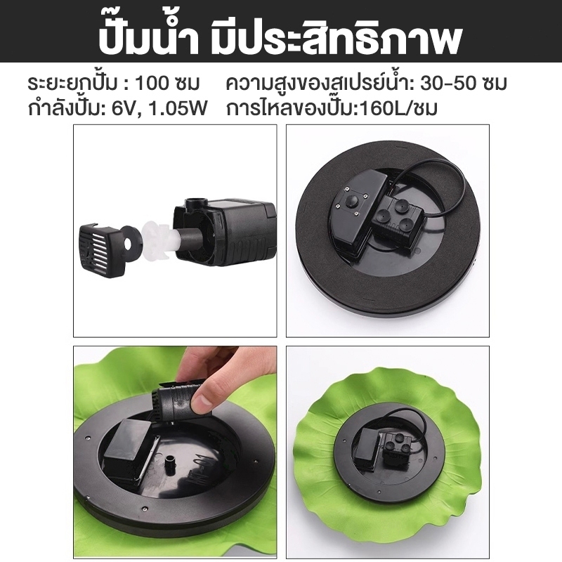 คุณสมบัติ น้ำพุพลังเเสงอาทิตย์ น้ำพุโซล่าเซลล์ ตกแต่งสวน คุณสมบัติการใช้งาน : เหมาะสำหรับใช้ทำน้ำพุตกเเต่งสวนสวย สถานที่ทั่วไป (เกสต์เฮ้าส์, รีสอร์ท ,โรงแรม, อาคารพาณิชย์ เป็นต้น) เพื่อตกเเต่งให้ดูมีชีวิตชีวามากขึ้นจากพลังงานธรรมชาติไม่สิ้นเปลืองไฟฟ