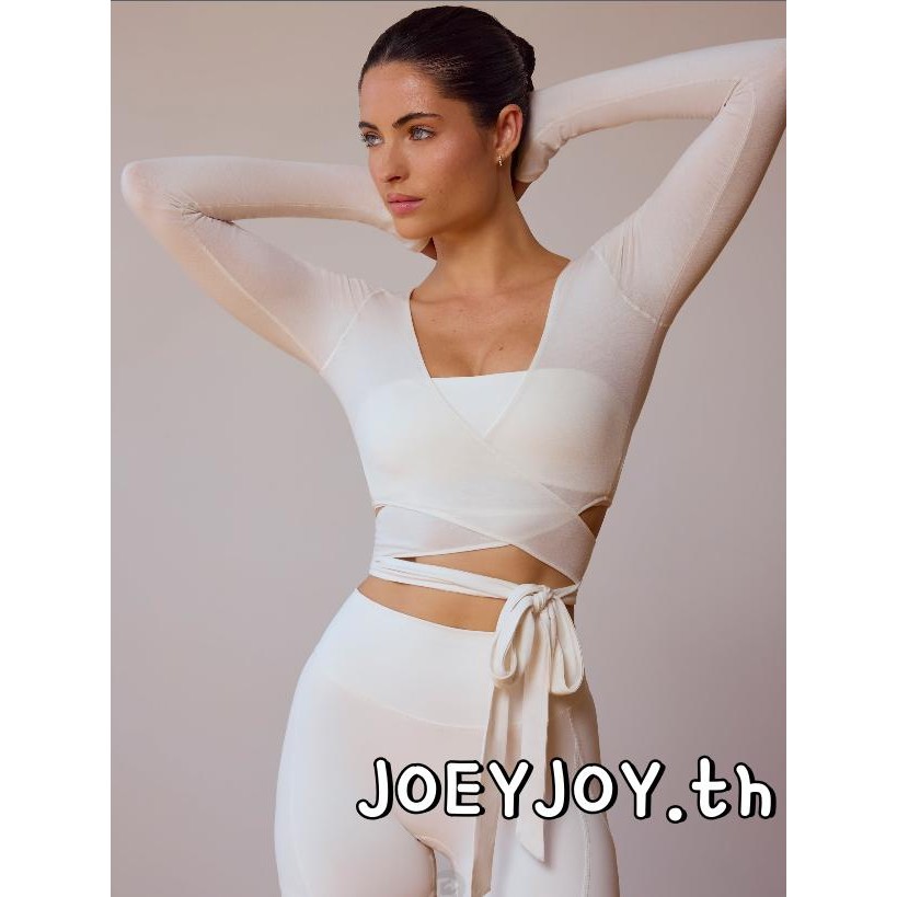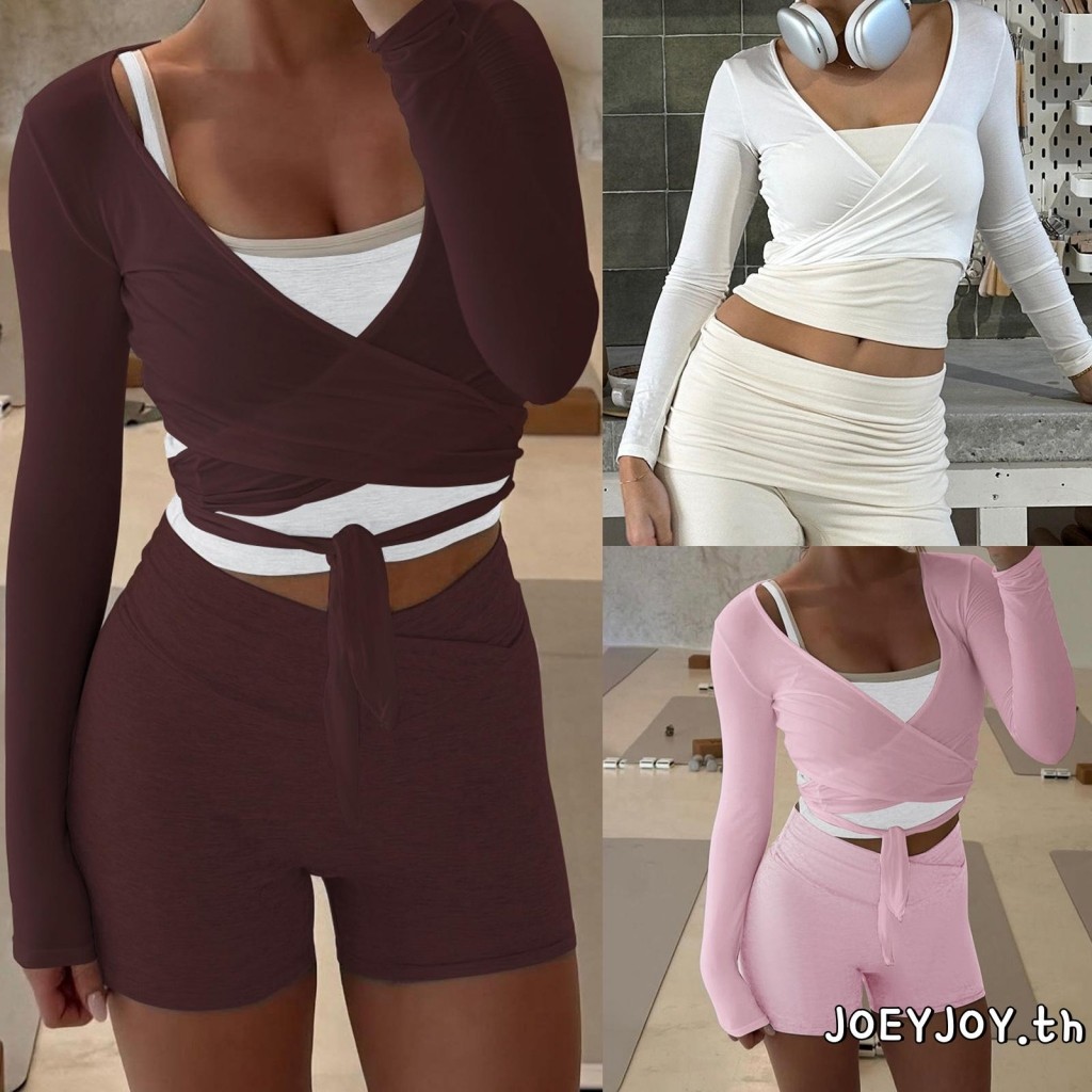 JOEYJOY-ผู้หญิงเสื้อโยคะฟิตเนสสีทึบ Tie-Up ด้านหน้าคอวีแขนยาว Bottoming เสื้อออกกําลังกายไม่มีรอยต่อ