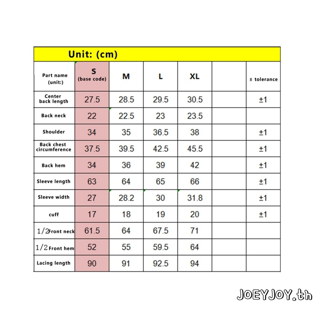 S ความยาว: 27.5 แขนเสื้อ: 63 ไหล่กว้าง: 34 หน้าอกด้านหลัง: 37.5