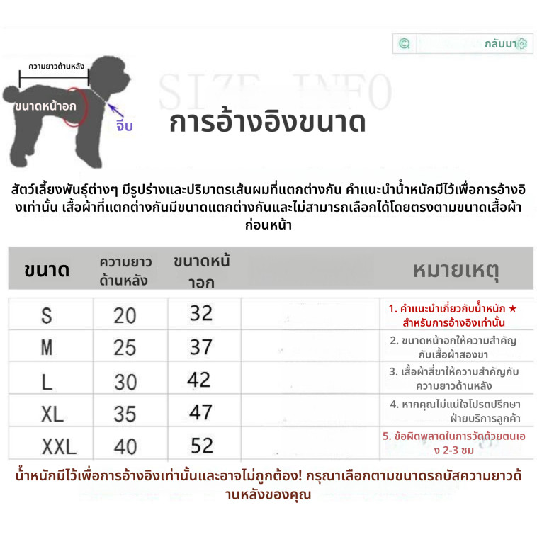 โปรดวัดน้ำหนักและความยาวของหน้าอกสัตว์เลี้ยงของคุณก่อนซื้อ