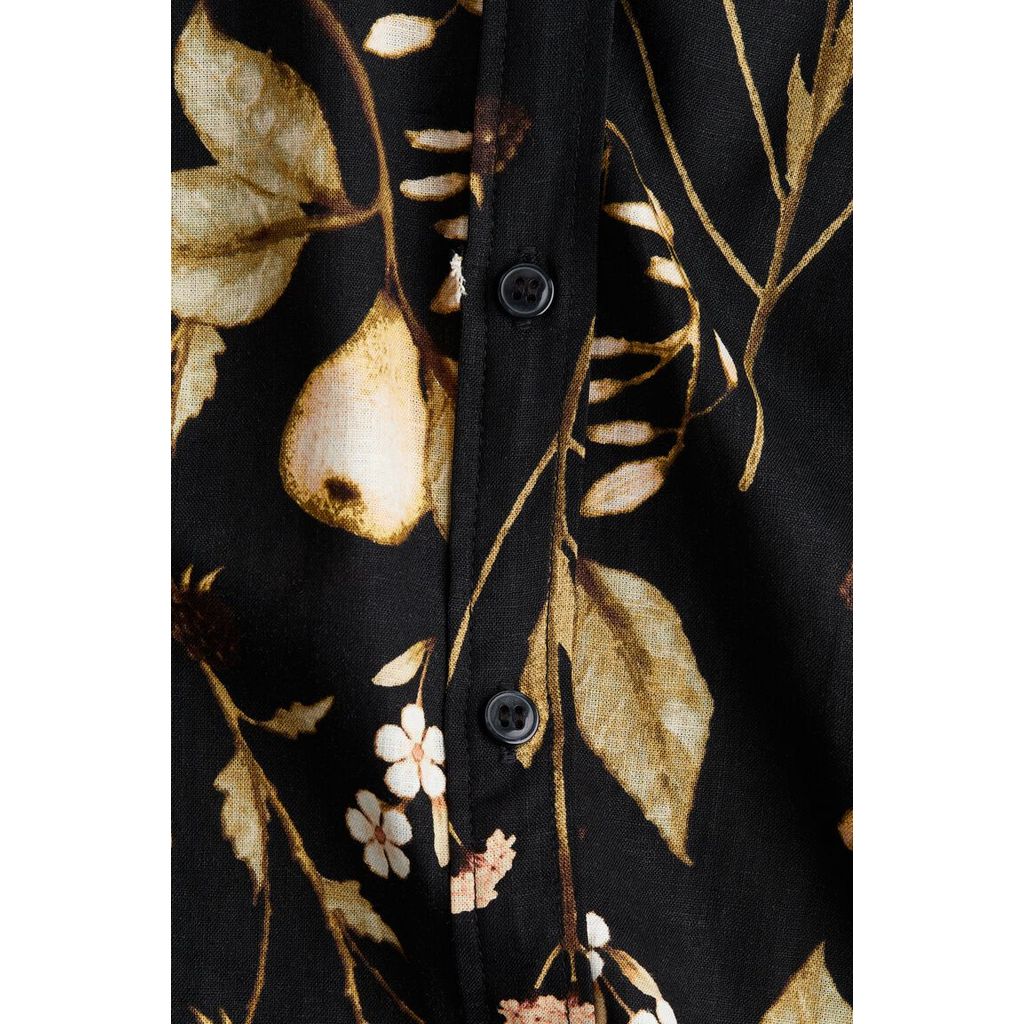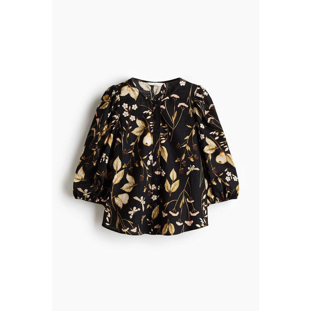 เสื้อเบลาส์แบบฟิตในผ้าที่ระบายอากาศได้ดี ทำจากผสมลินิน คอเสื้อทรงกลม ติดกระดุมด้านหน้า และแขนบานโบลล่อนความยาว 3/4 พร้อมปลายแขนยืดหยุ่น