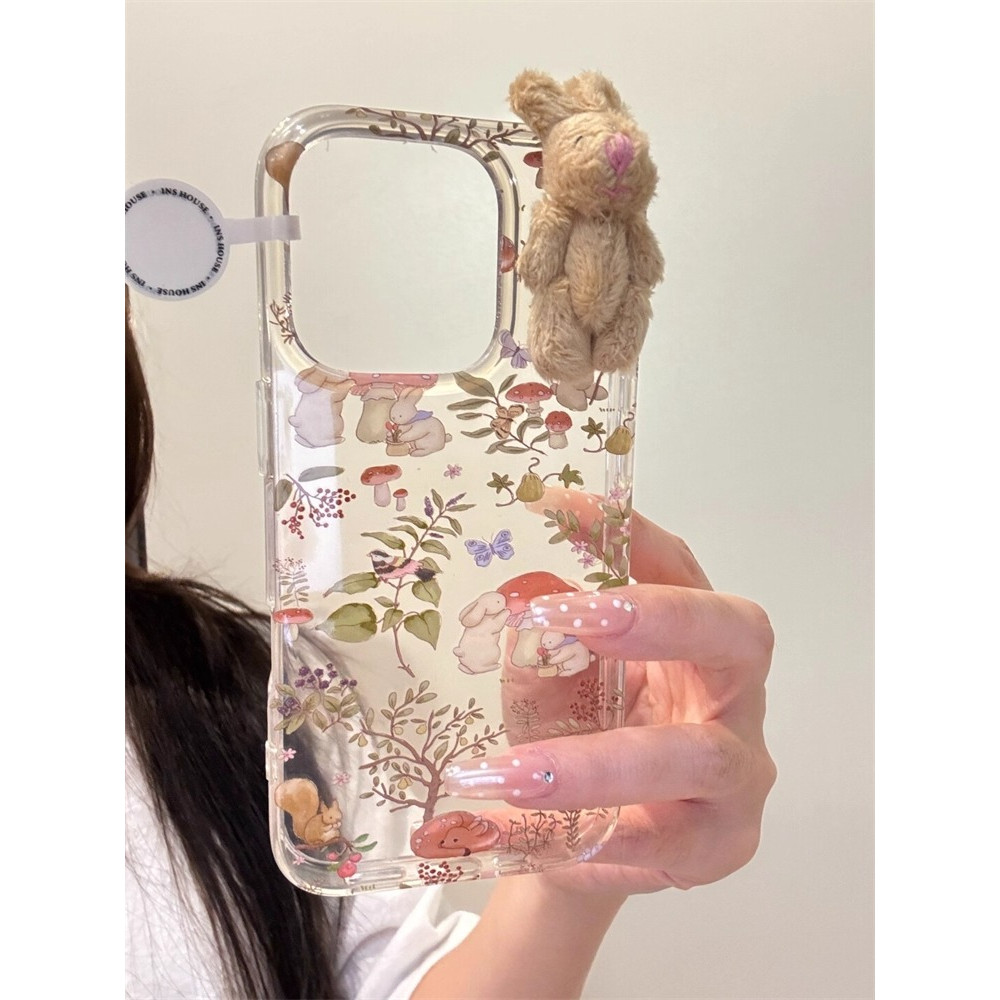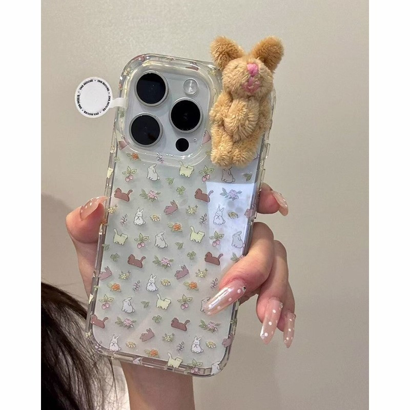 IPhone 16 15 14 13 12 11 Pro Max X XR XS Max 7 8 Plus ดอกไม้น่ารัก 3D กระต่ายการ์ตูนคู่โปร่งใสป้องกันการตกเคสโทรศัพท์ปกอ่อน