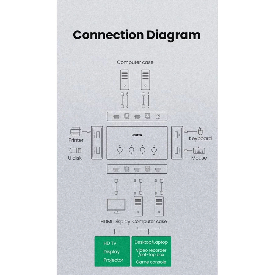 The UGREEN 4 IN 1 OUT KVM HDMI Switch CM608 (90810) is a versatile and convenient device that allows you to control and switch between multiple HDMI-enabled dev