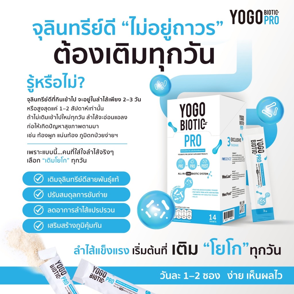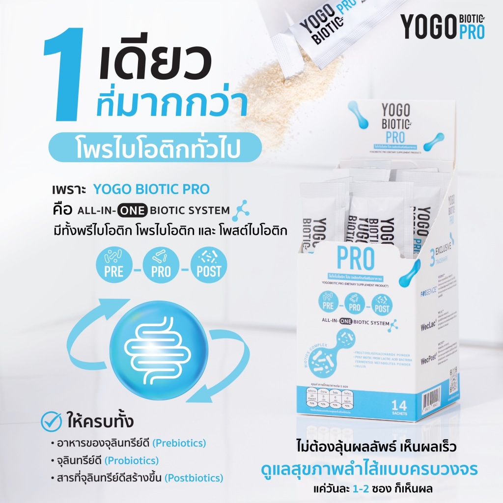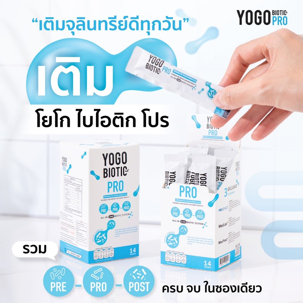 ✨ เติมจุลินทรีย์ดีทุกวัน เติม "YOGO BIOTIC PRO™" ? ?ALL-IN-ONE BIOTIC SYSTEM รวม 3 พลังจุลินทรีย์ดี ครบจบในซองเดียว Prebiotics + Probiotics + Postbiotics ? เหนือกว่าโพรไบโอติกทั่วไปยังไง? ✅ Fossence® – พรีไบโอติกระดับเวชภัณฑ์เด็ก ปลอดภัยสูง เหมาะกับทุกวัย