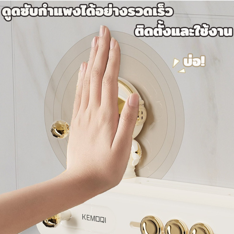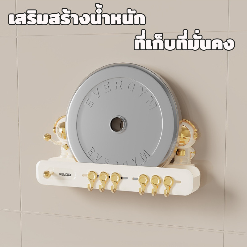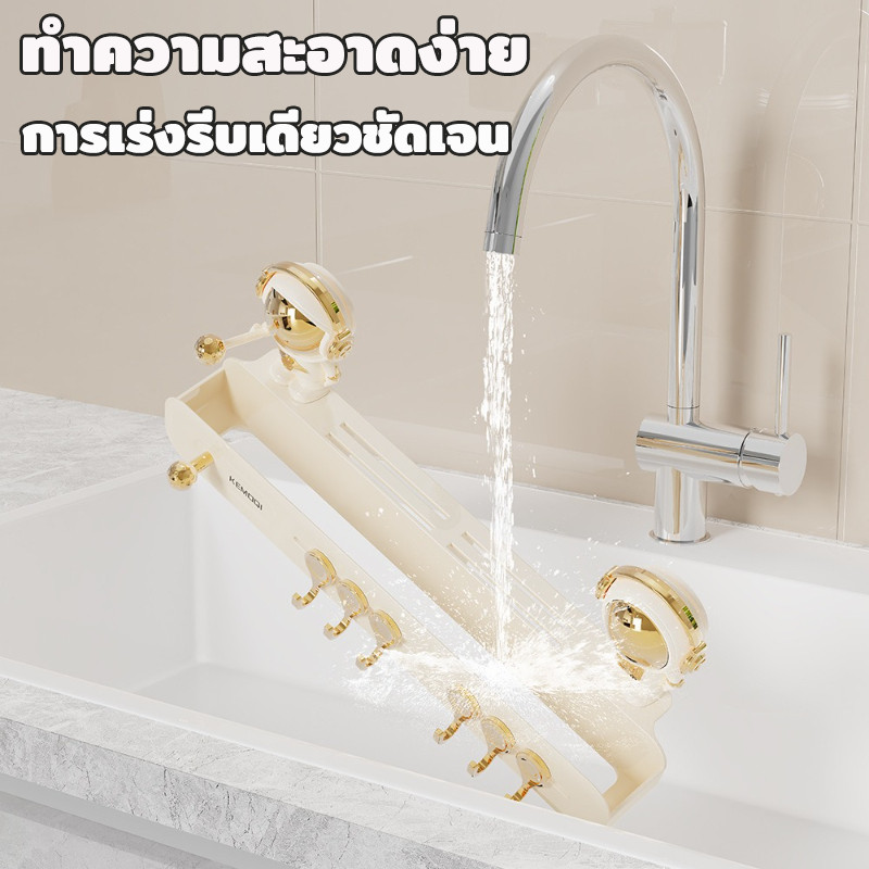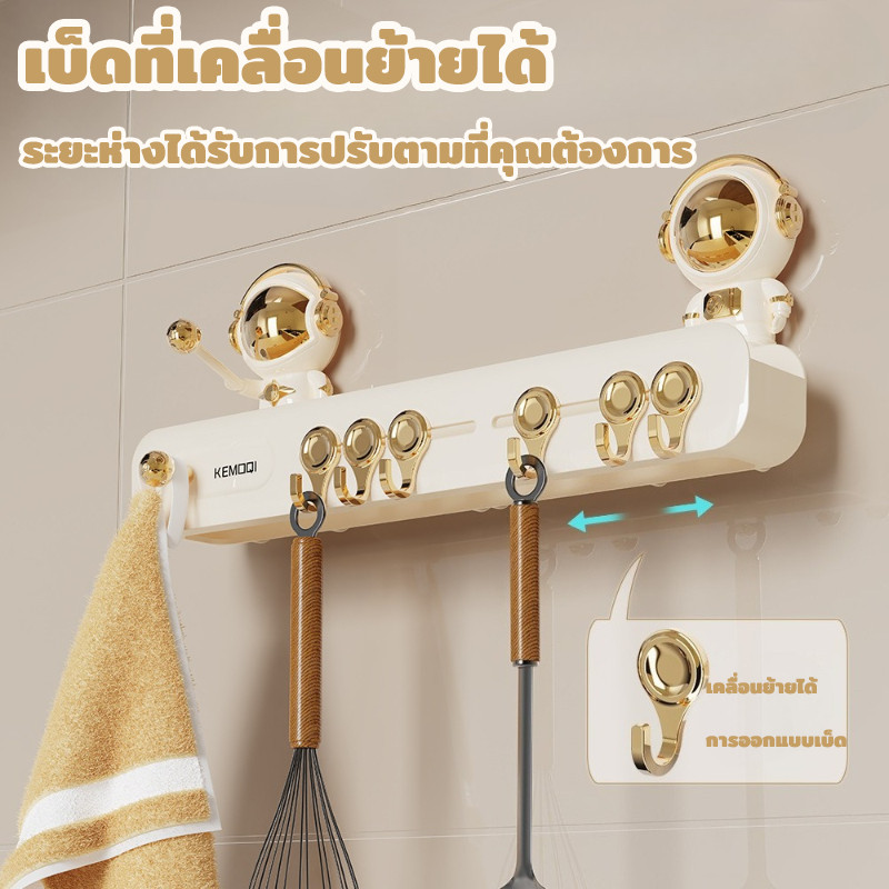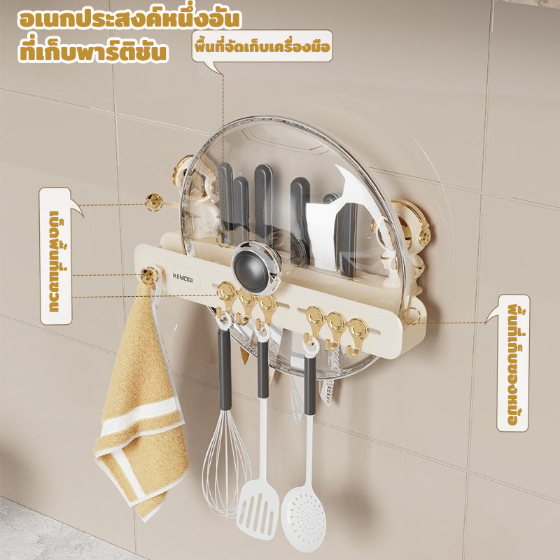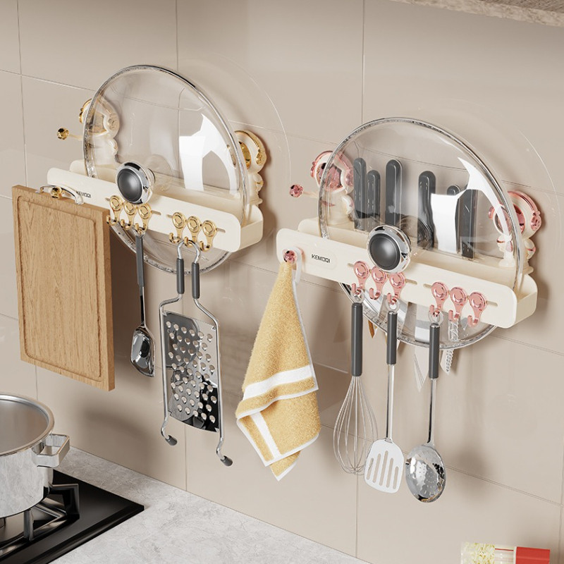 แร็คแขวนผนังห้องครัว ชั้นวางตะขอฟรีหมัด แร็คเครื่องครัวแบบมัลติฟังก์ชั่นแบบมัลติฟังก์ชั่นถ้วยดูด