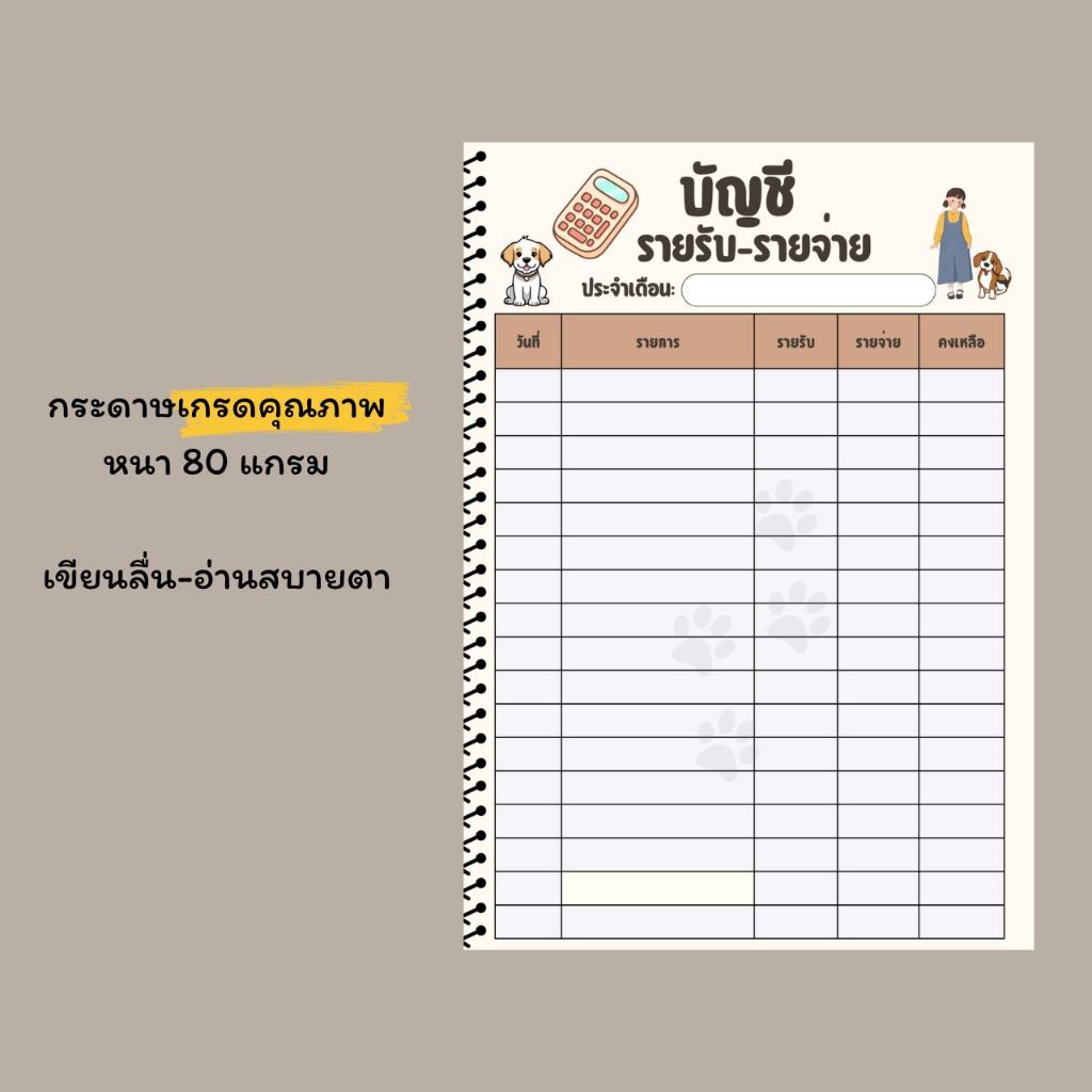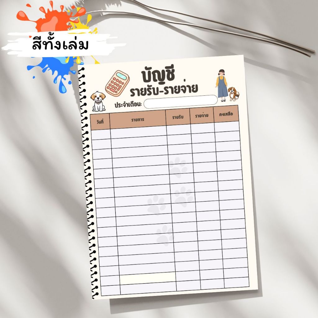 สมุดบันทึกรายรับรายจ่าย สีทั้งเล่ม ขนาด A5 เข้าเล่มแบบสันเกลียว ปกหนา 240 แกรม รวม 42 หน้า คุ้มค่า
