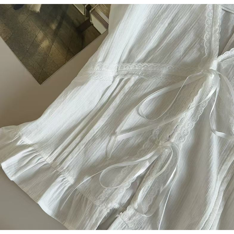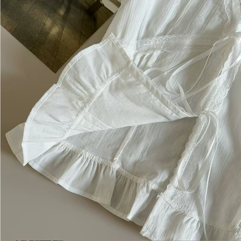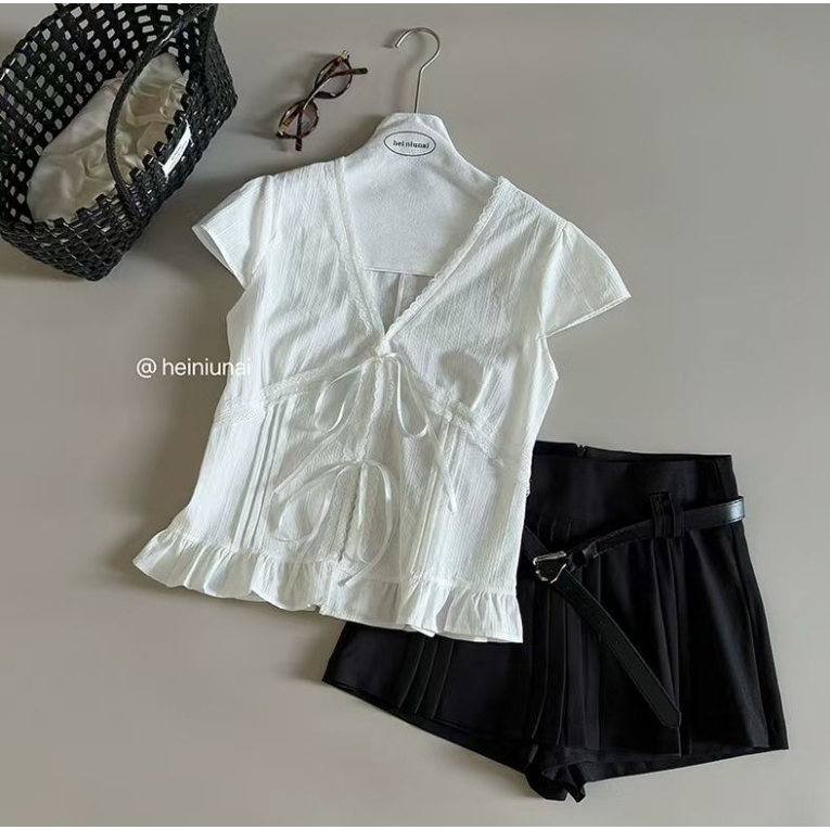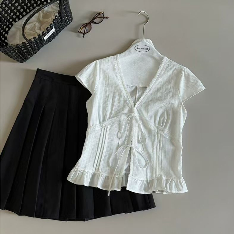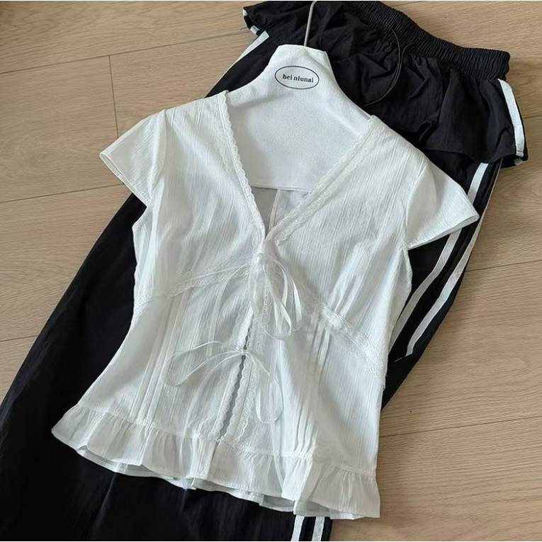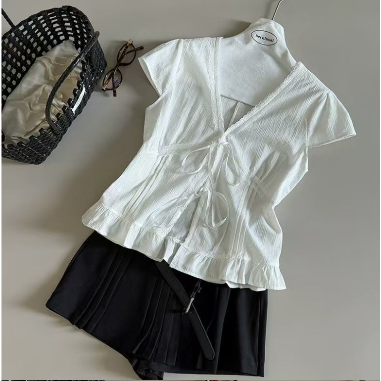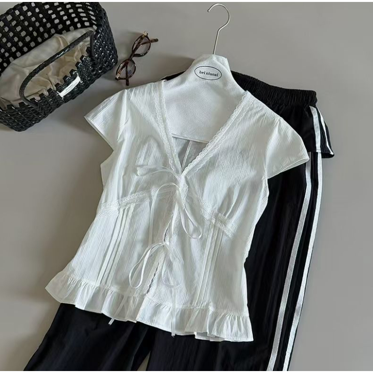 MONA~Xเวอร์ชั่นเกาหลี คอวี สีทึบ ประกบ ลูกไม้ แขนสั้น เสื้อเชิ้ต สไตล์ใหม่