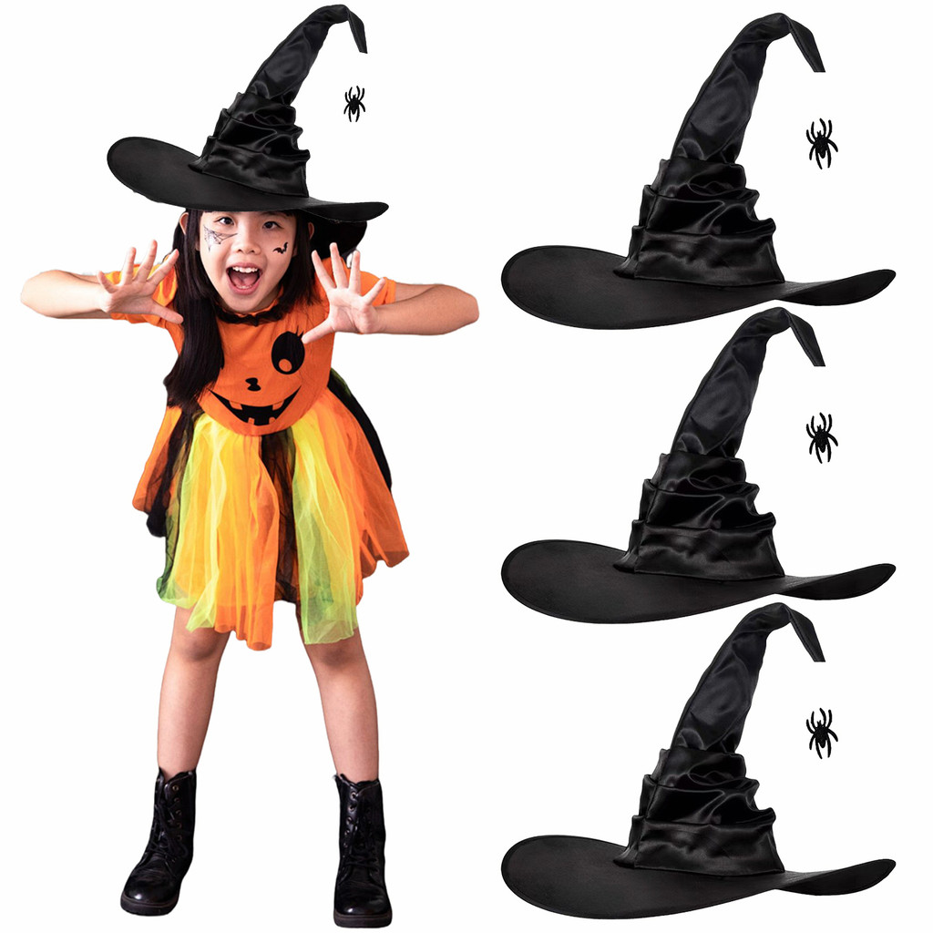 หมวกแม่มดฮาโลวีนพร้อมการออกแบบแมงมุมสีดํา, คอสเพลย์คาถาปาร์ตี้ผี, อุปกรณ์เครื่องแต่งกายผ้าที่ทนทานสําหรับผู้ใหญ่และเด็ก