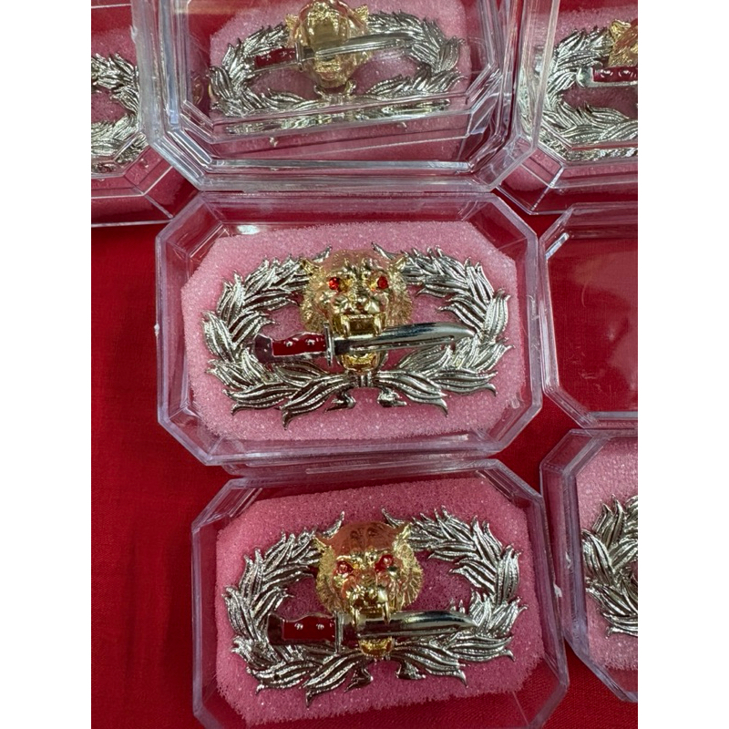 เครื่องหมายเสือคาบดาบแบบหมุดตาลงสีแดงมีกล่องแก้วให้1กล่องสินค้าพร้อมส่ง
