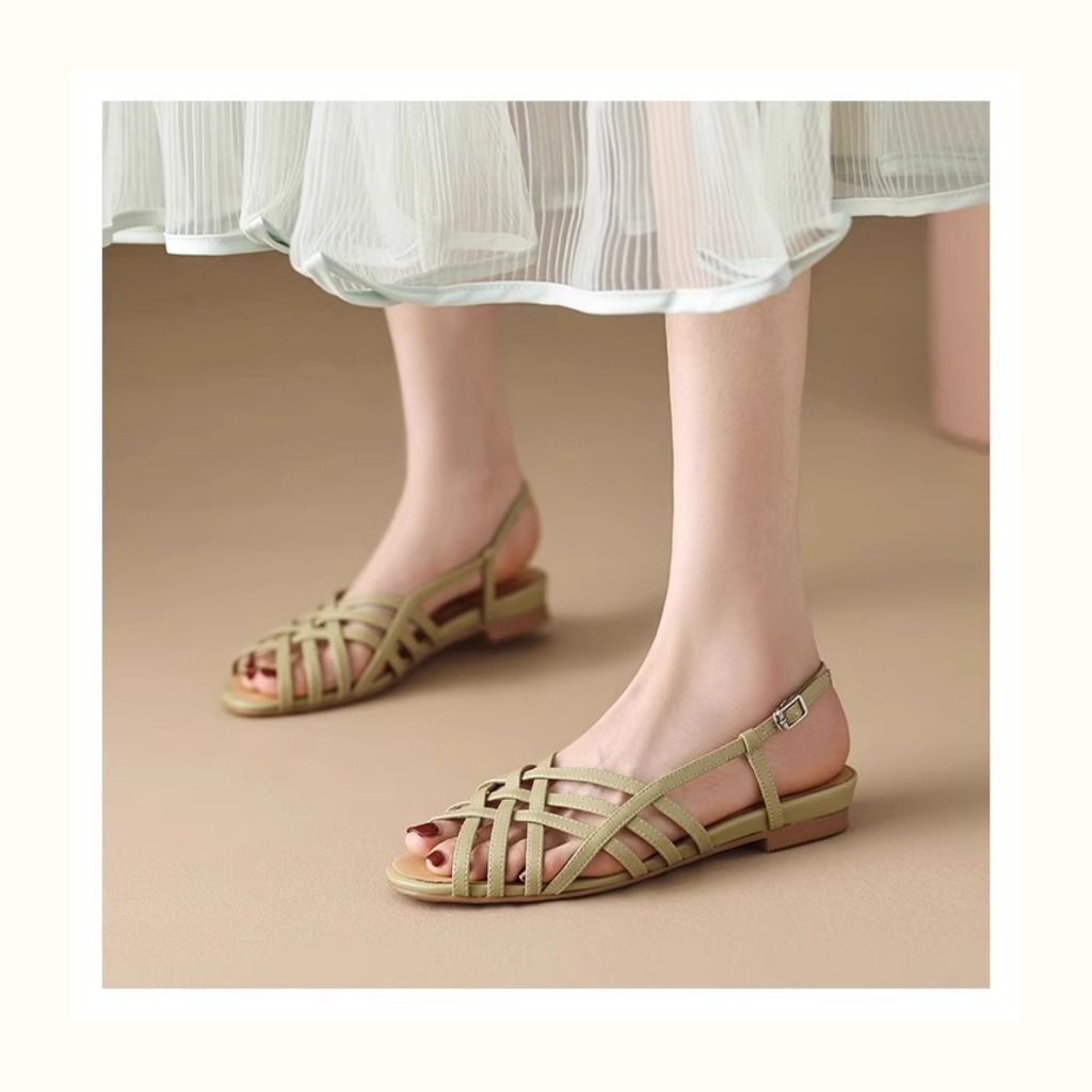 ในสต็อก Hollowed Out ถักเปิดนิ้วเท้าโรมันรองเท้าแตะแบนผู้หญิง 2025 ฤดูร้อนใหม่หนังแท้สบาย ๆ ร้อยรองเท้าแตะโรมัน