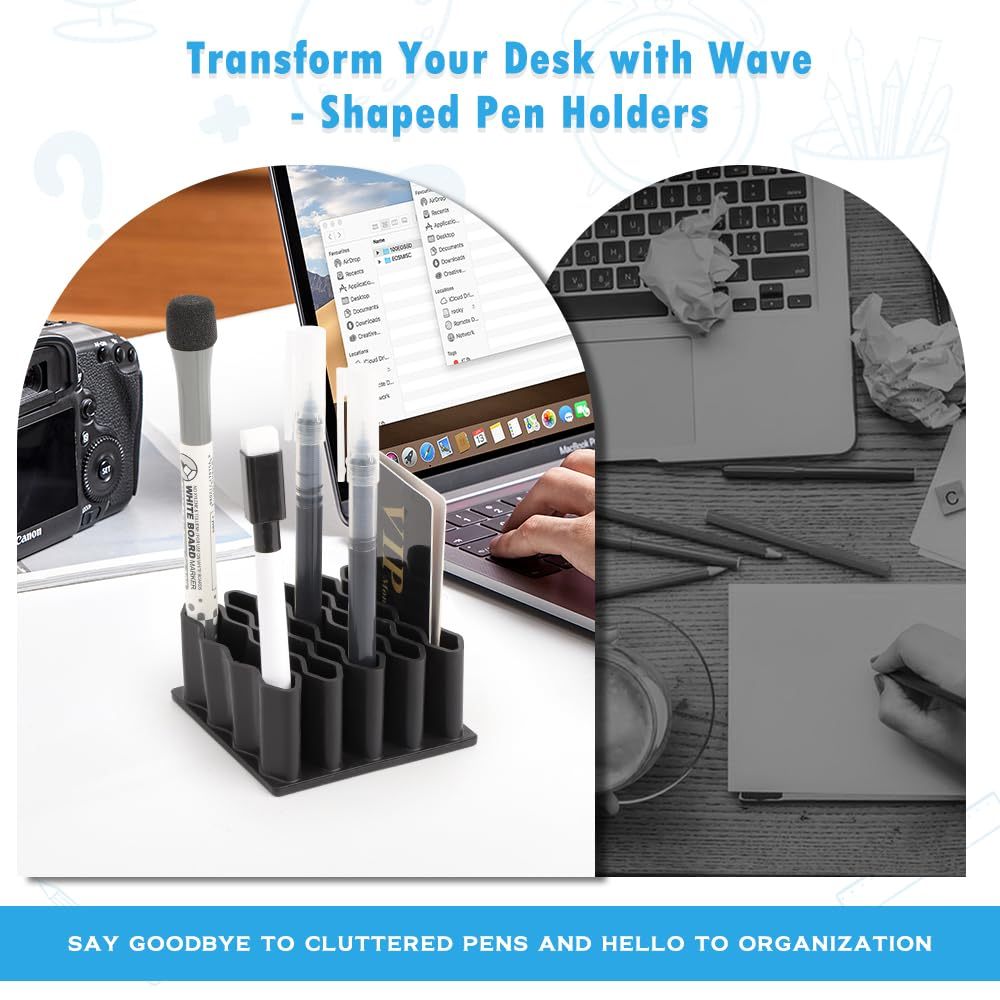 ⦿ดีไซน์คลื่นเพื่อความสะดวกสบายสูงสุด: รูปทรงคลื่นอันเป็นเอกลักษณ์ช่วยให้คุณใส่และเก็บอุปกรณ์การเขียนขนาดต่างๆ ได้อย่างง่ายดาย เช่น ปากกาไวท์บอร์ดด้ามกว้าง ดินสอ ปากกาสี หรือแม้แต่มีดขนาดเล็กหรือแปรงแต่งหน้า ไม่ต้องยุ่งยากกับที่ใส่ปากกาแบบหลวมอ