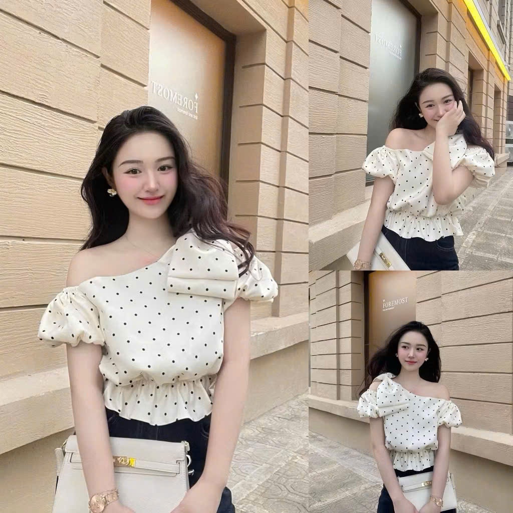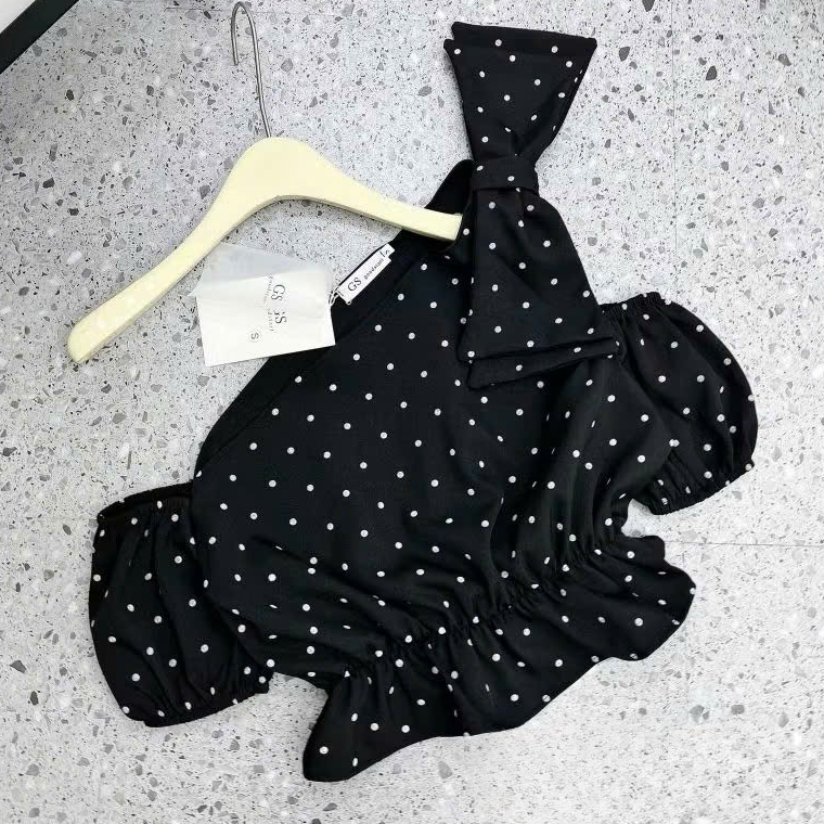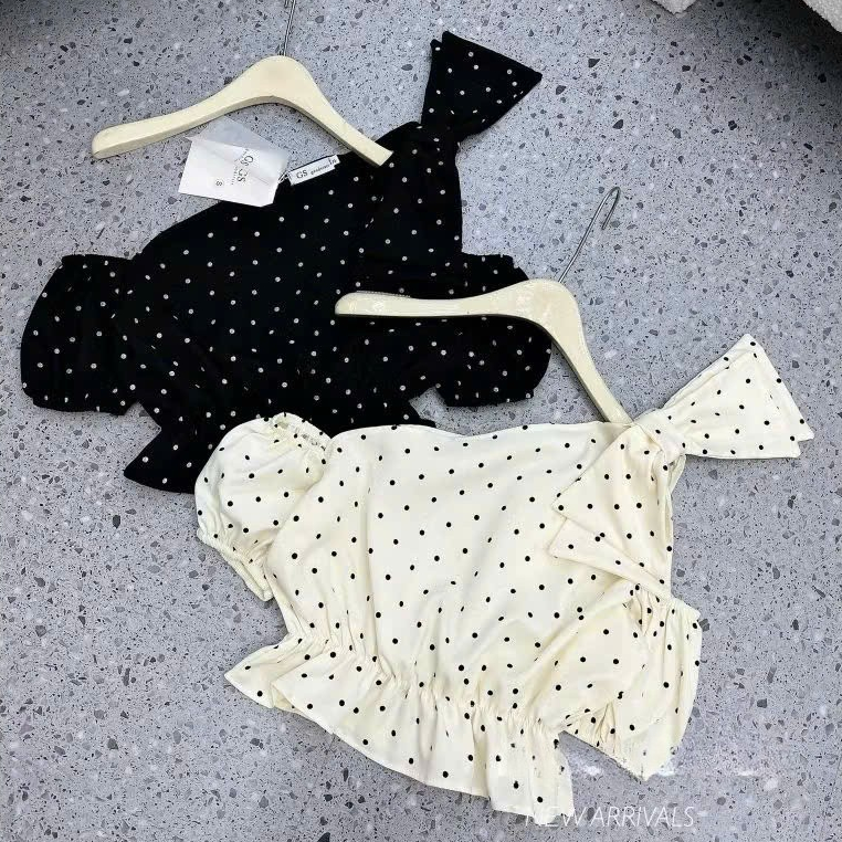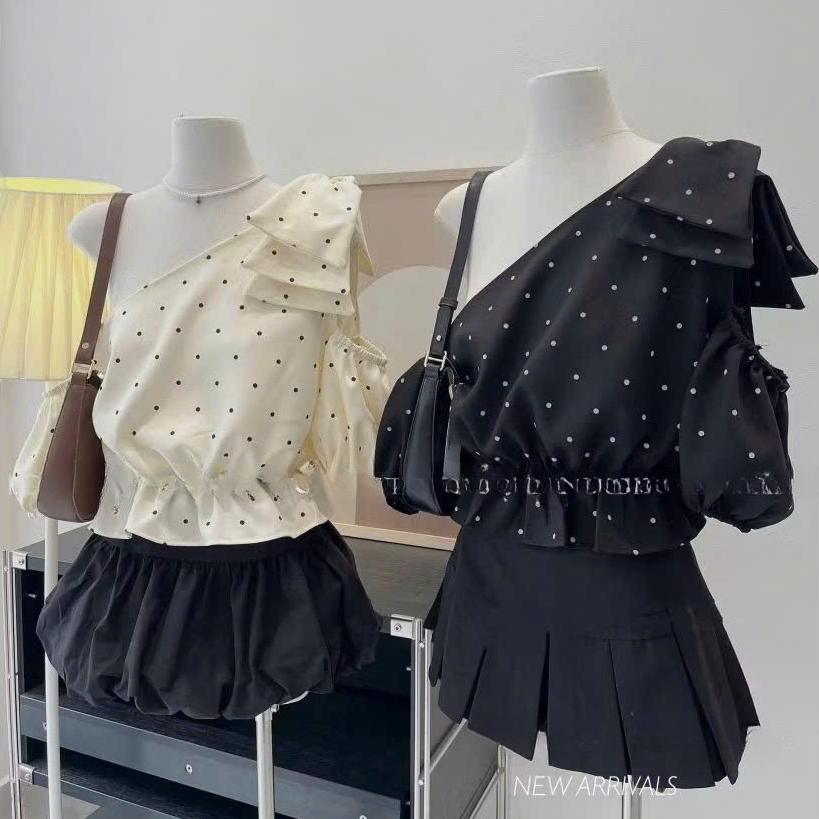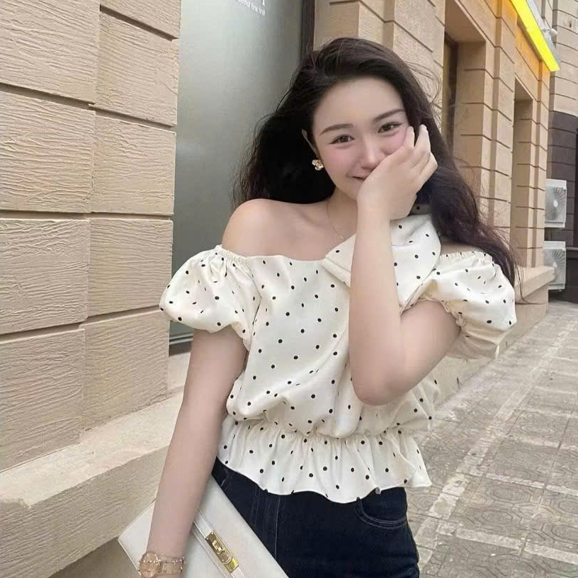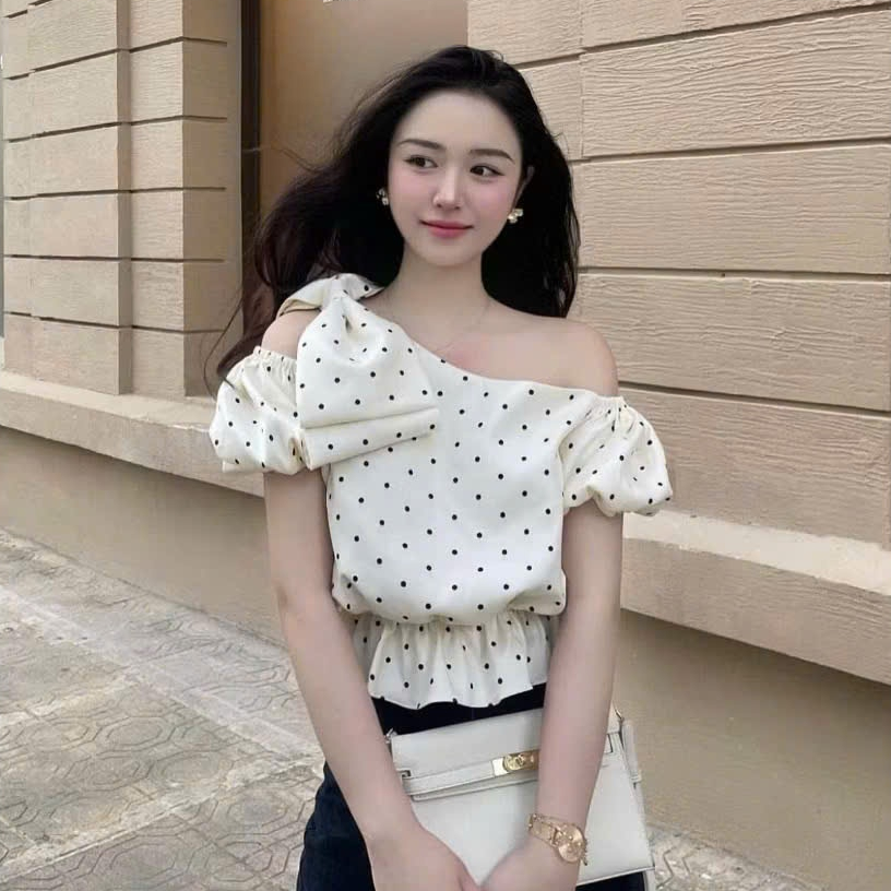 เสื้อท็อปลายจุดปาดไหล่ มิ้มอ้วน ผูกโบว์ เท่ ดูดซับเหงื่อ สไตล์เลดี้ ออกไปข้างนอก ไปทํางาน นาโนเมตร0923