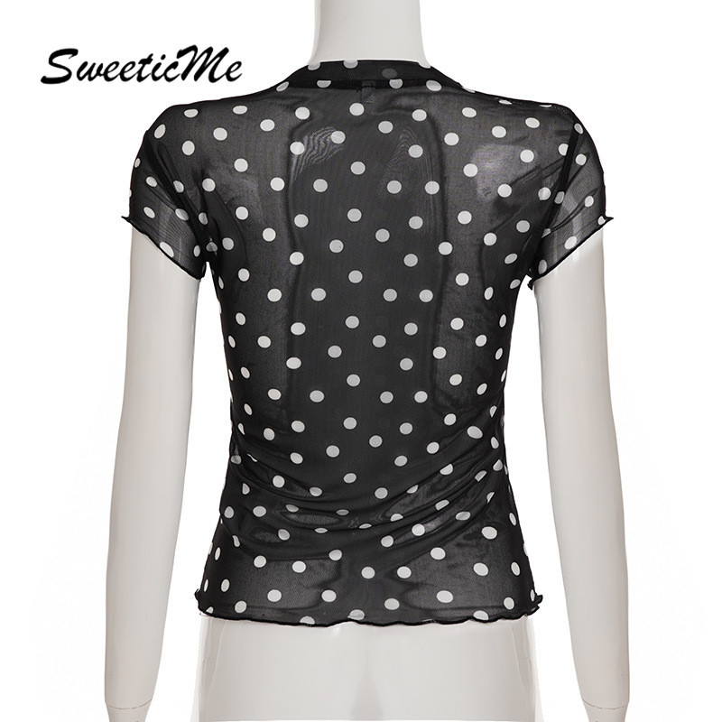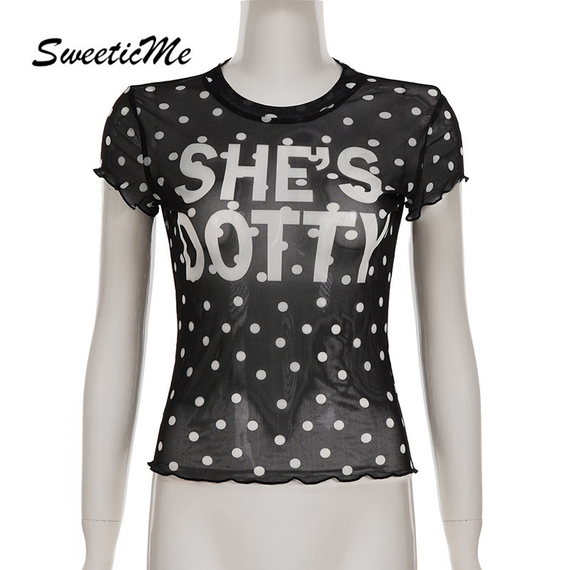 เสื้อยืดแขนสั้นลายจุดและตัวอักษร พิมพ์เซ็กซี่แบบใหม่ พร้อมเนื้อผ้าตาข่ายทึบ สำหรับวันหยุดในปี 2025