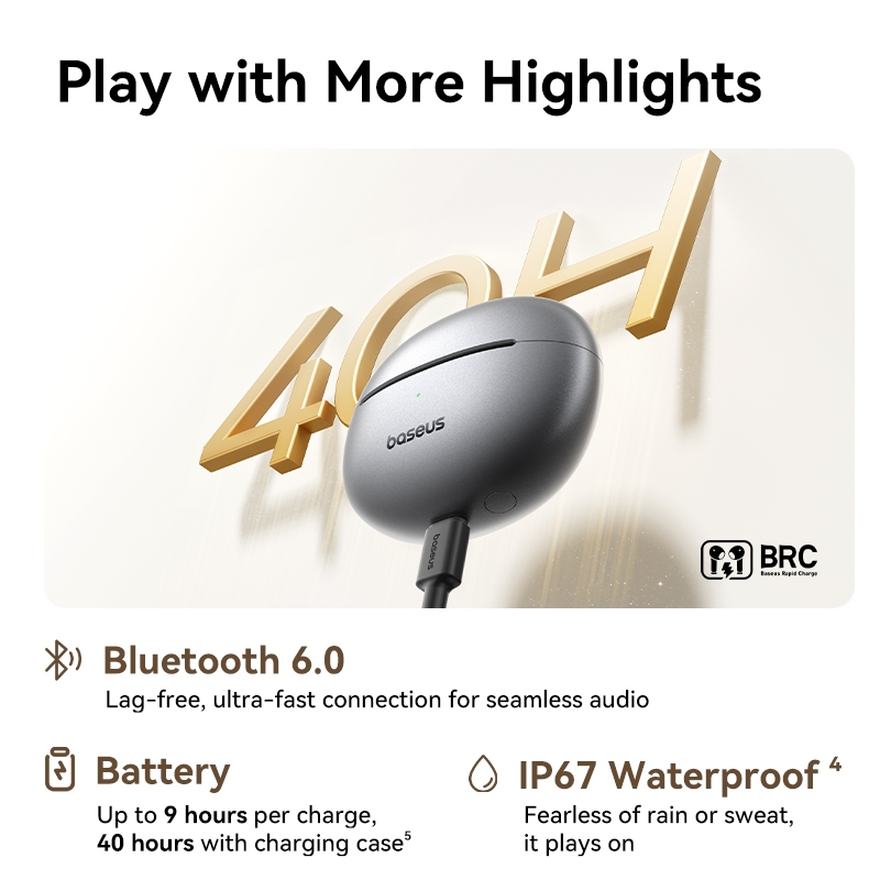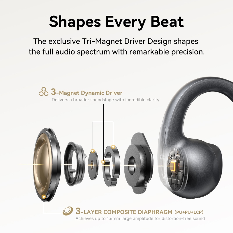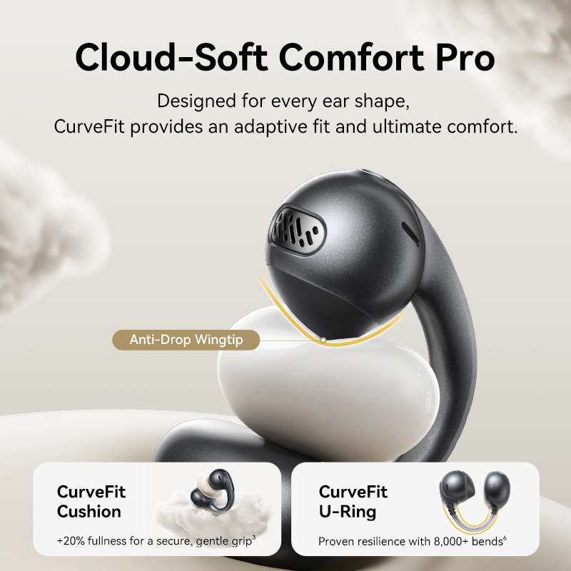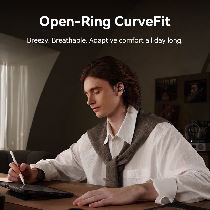 หูฟังแบบเปิดหู Baseus Bowie MC1 Pro Open-Ear TWS ผสมผสานความเบาสบาย 5 กรัมเข้ากับเบาะรองนั่ง CurveFit และ U-ring แบบยืดหยุ่น ด้วยไดรเวอร์ Tri-Magnet, เทคโนโลยี LDAC, กันน้ำ IP67, แบตเตอรี่ 40 ชั่วโมงและปุ่มที่ควบคุมแอปจะส่งมอบเสียงสตูดิโอเป็นเวลาหลายวัน
