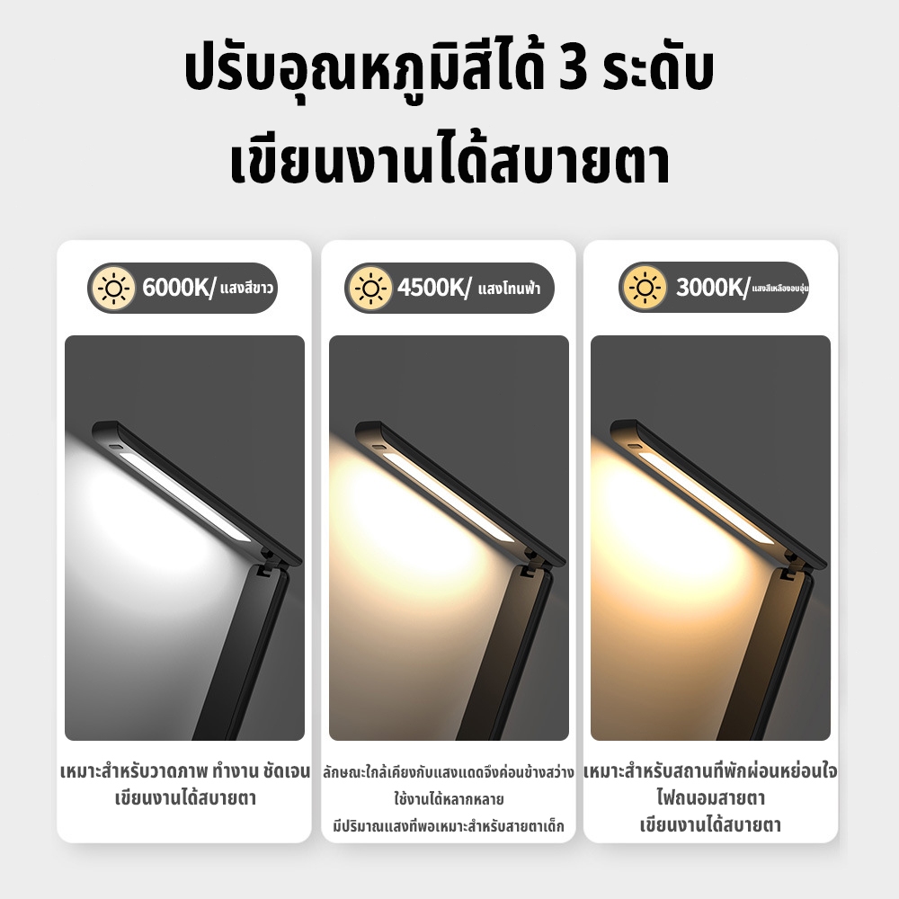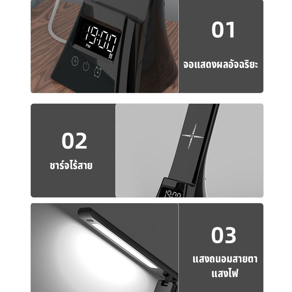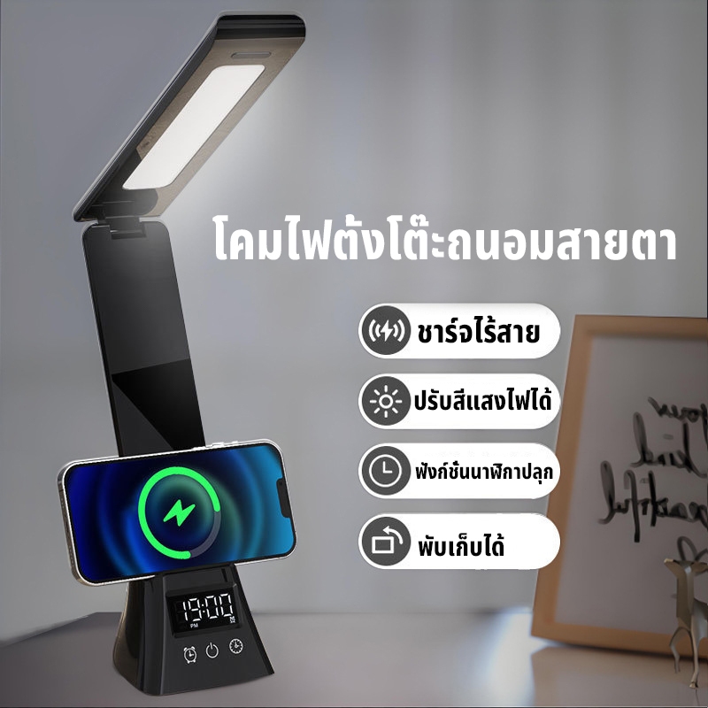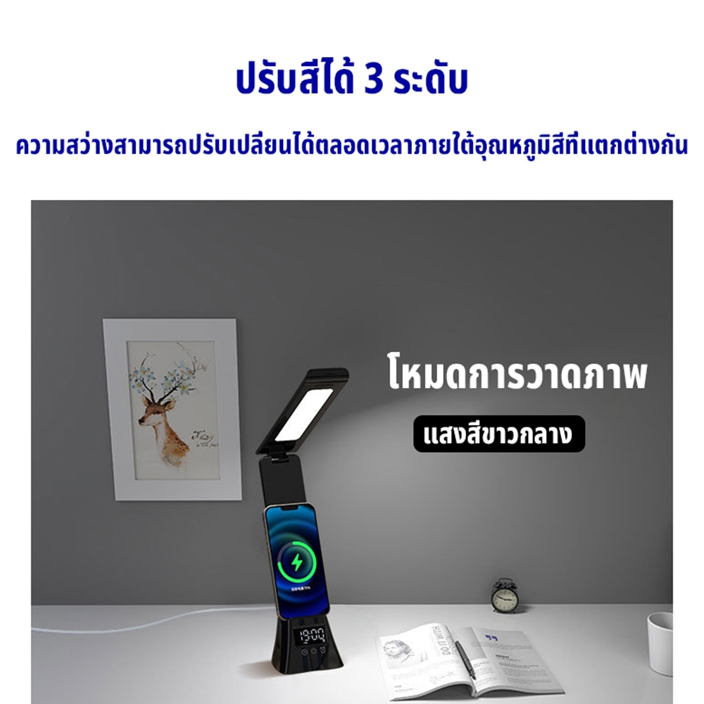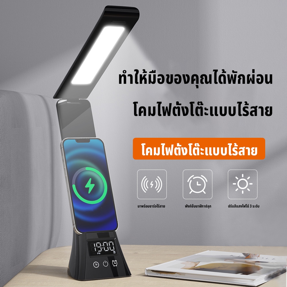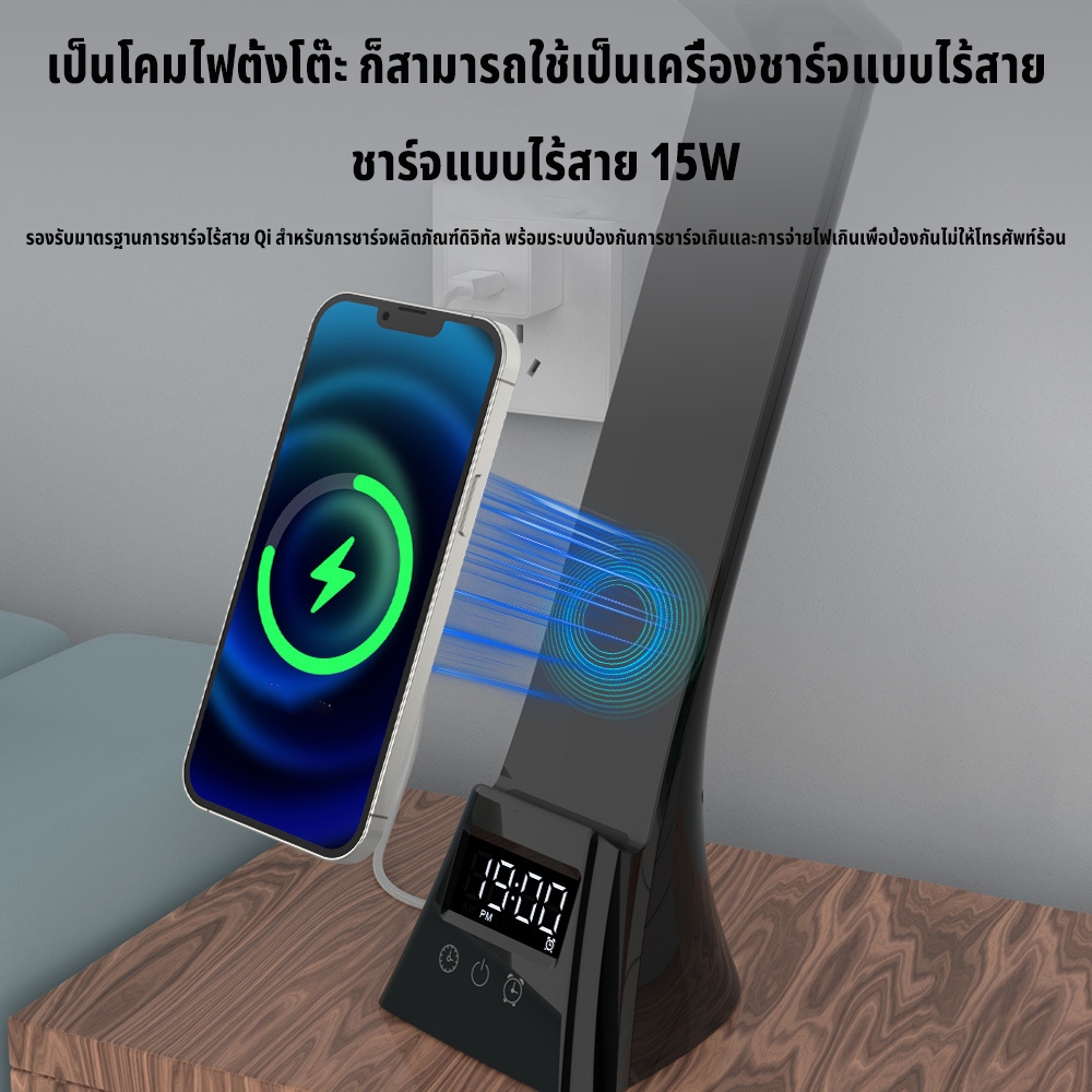 โคมไฟตั้งโต๊ะ โคมไฟอ่านหนังสือ ปรับแสงได้ 3สี ชาร์จมือถือแบบไร้สาย HDจอแสดงเวลา+นาฬิกาปลุก USB ชาร์จ ไฟตั้งโต๊ะ