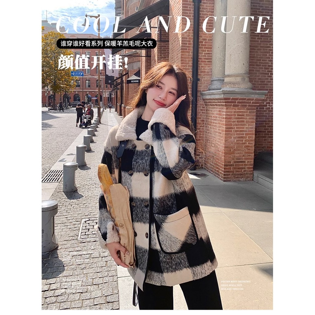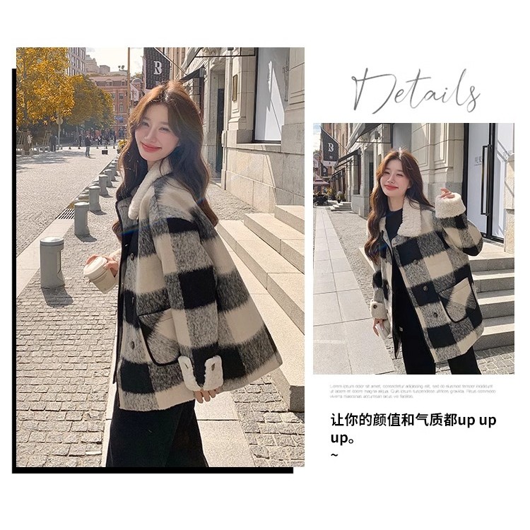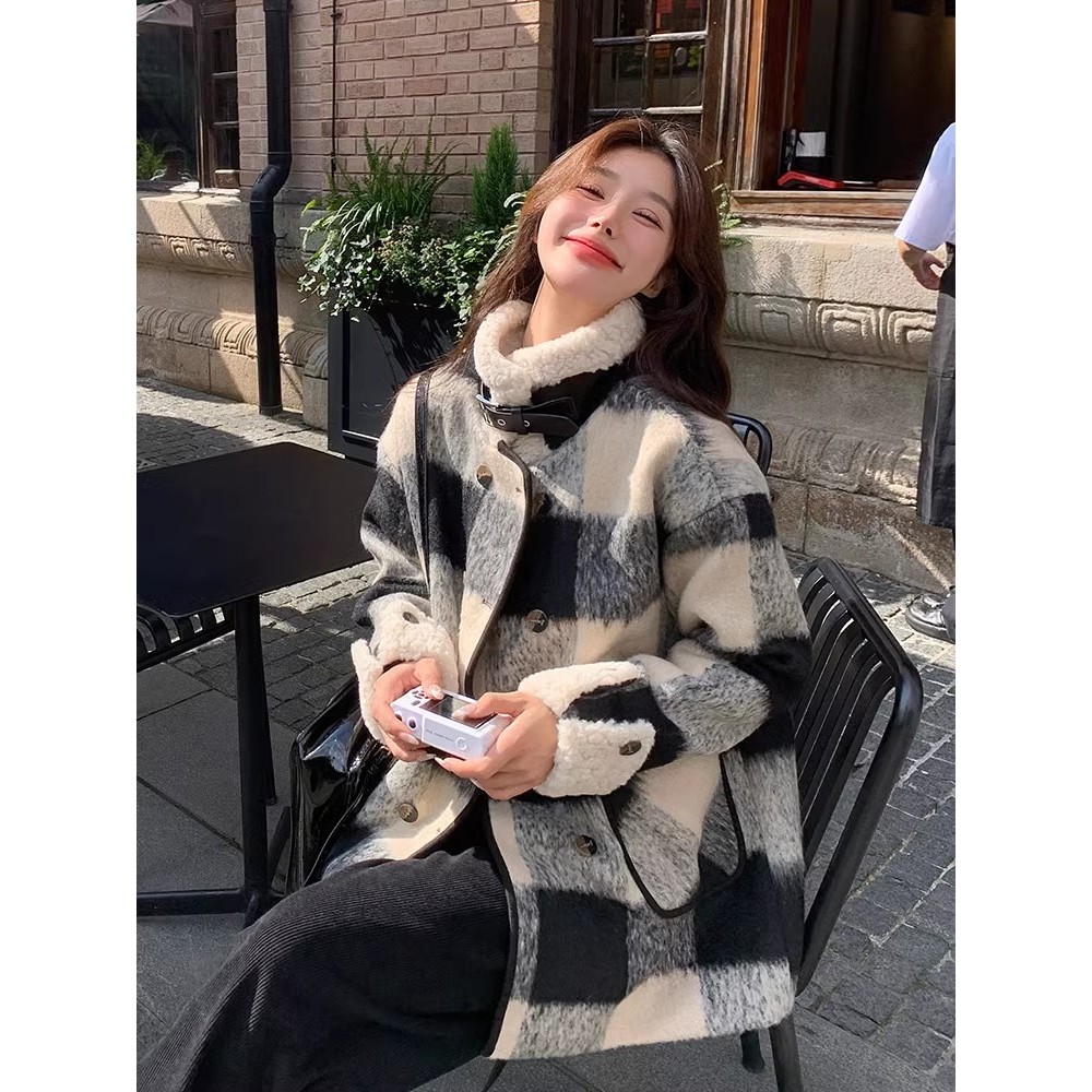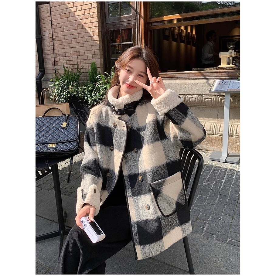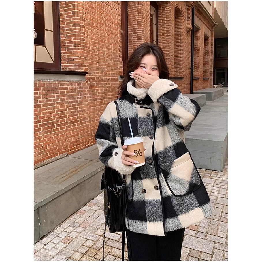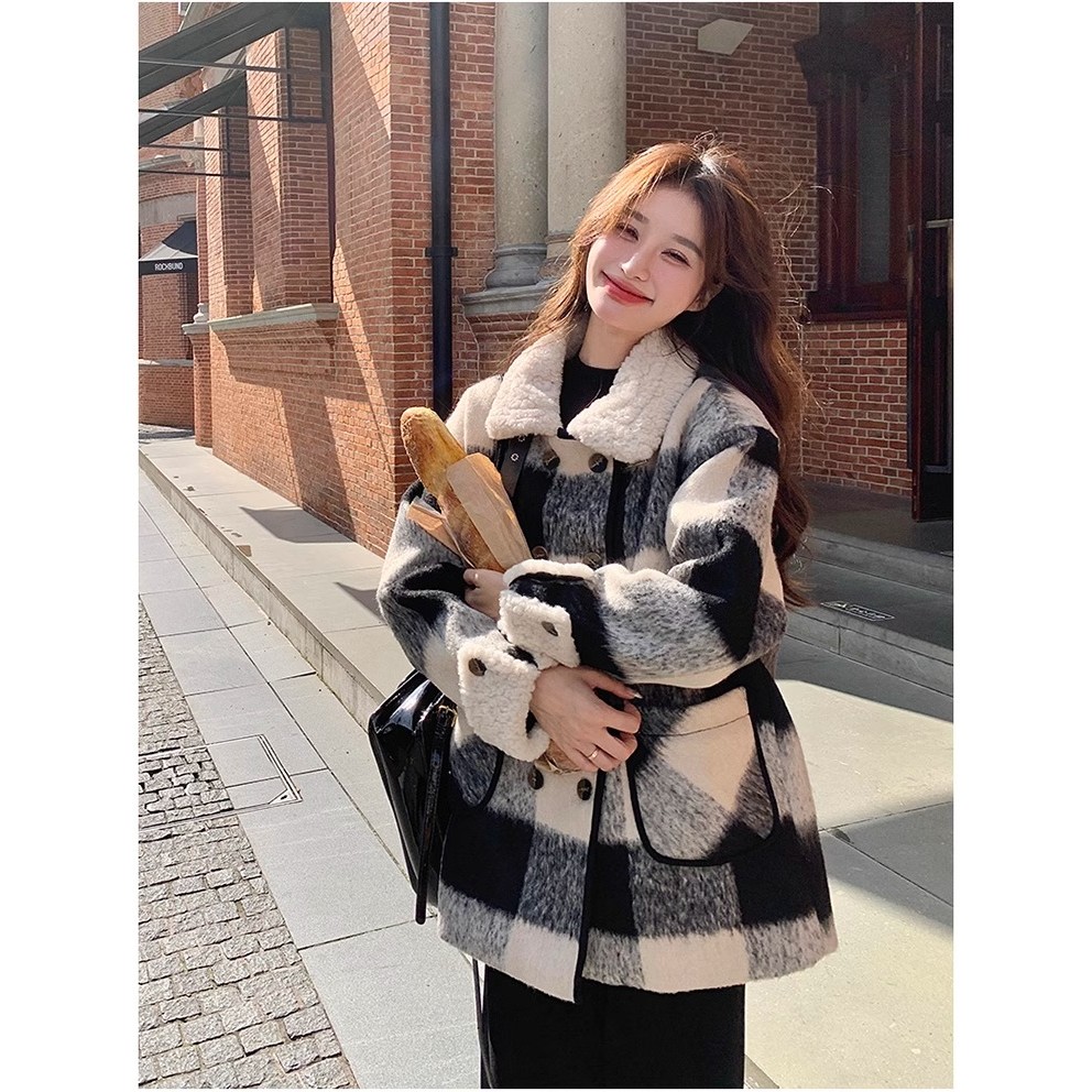 แจ็คเก็ตผ้าขนสัตว์หนา สีดำและขาว สำหรับผู้หญิง เหมาะสำหรับฤดูหนาว