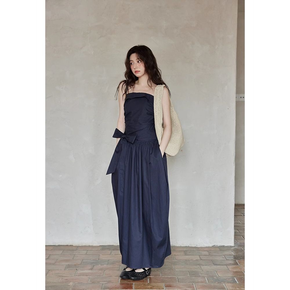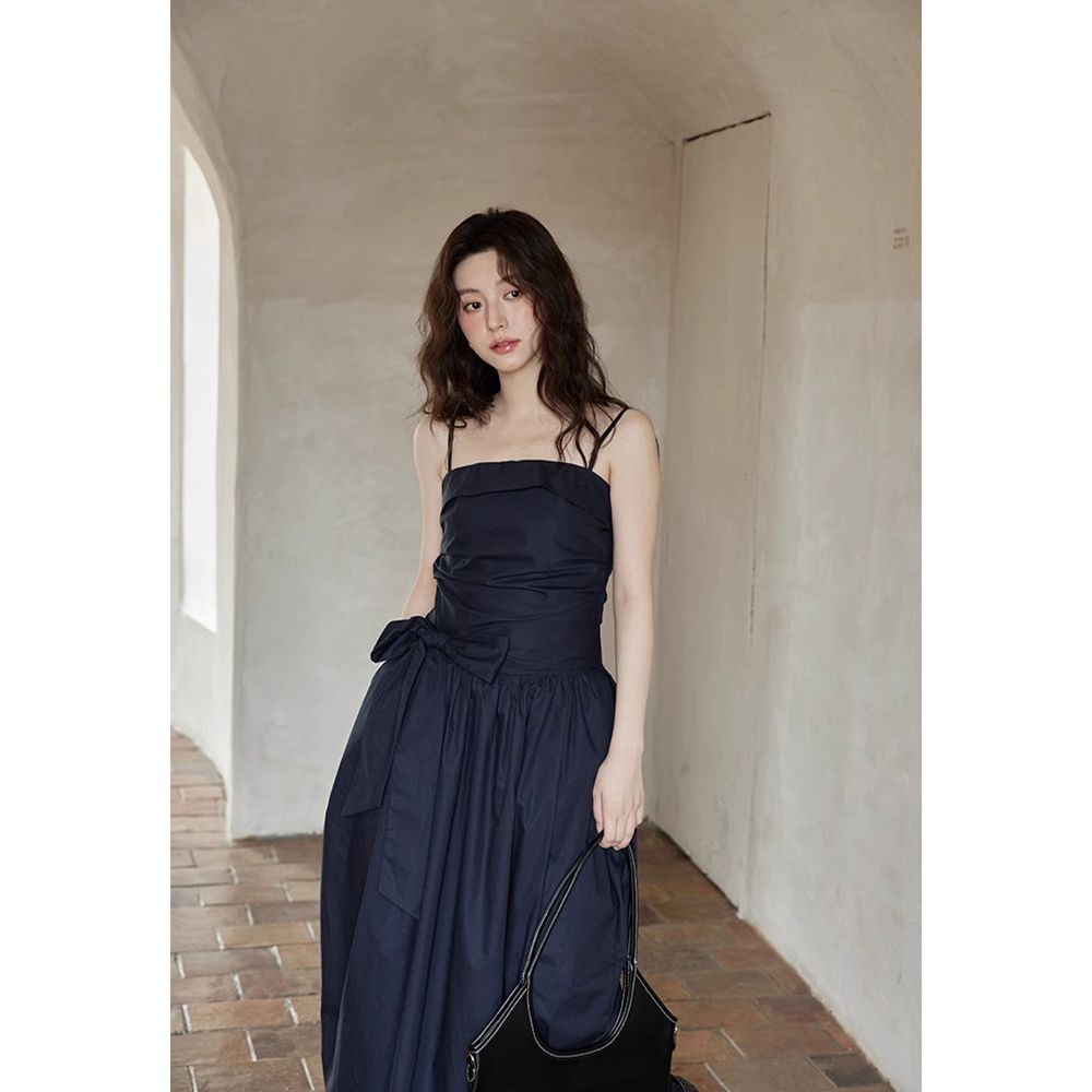 ความยาวกระโปรง: กระโปรงยาว ความยาวแขนเสื้อ: แขนกุดฝรั่งเศสย้อนยุคอายุลดเอวและกระโปรงใหญ่กระโปรงยาวฤดูร้อนชุดเดรสสีน้ำเงินใหม่