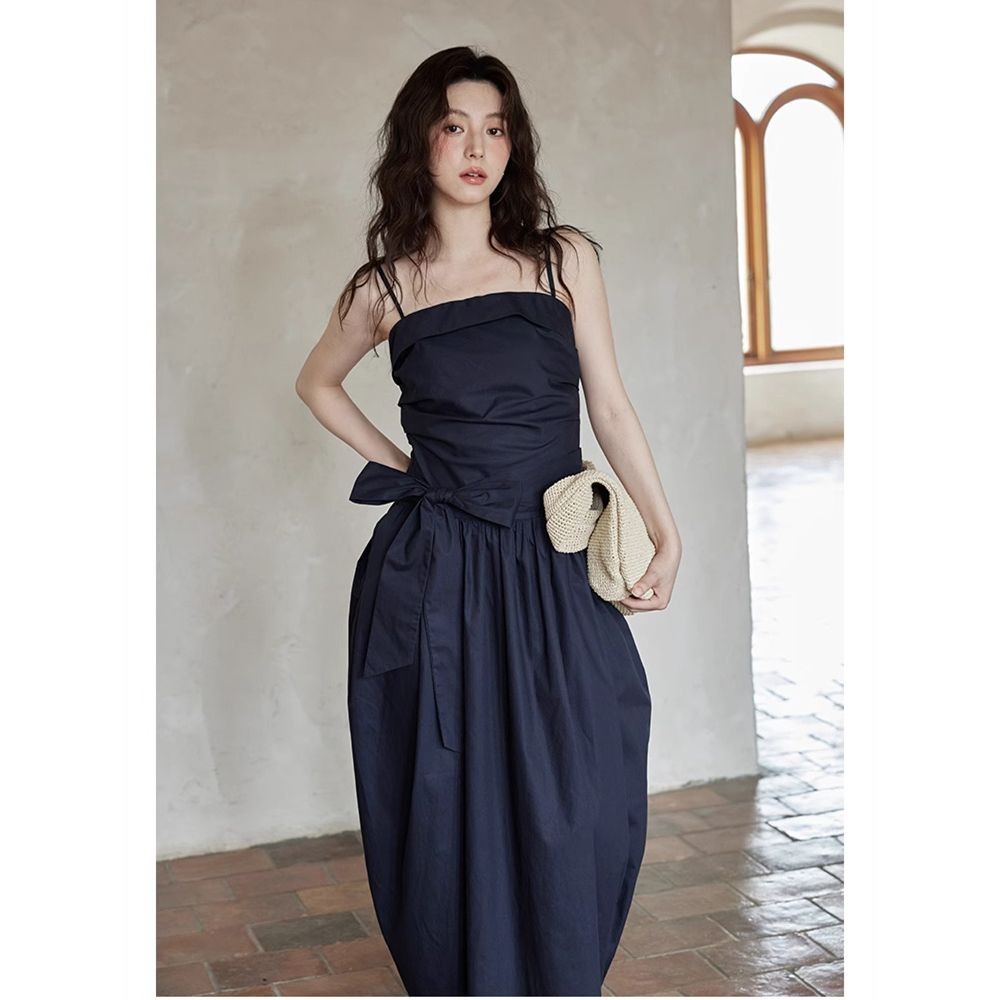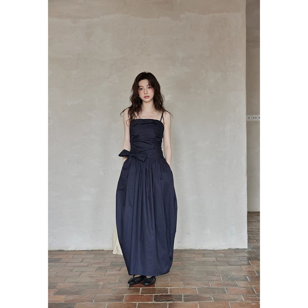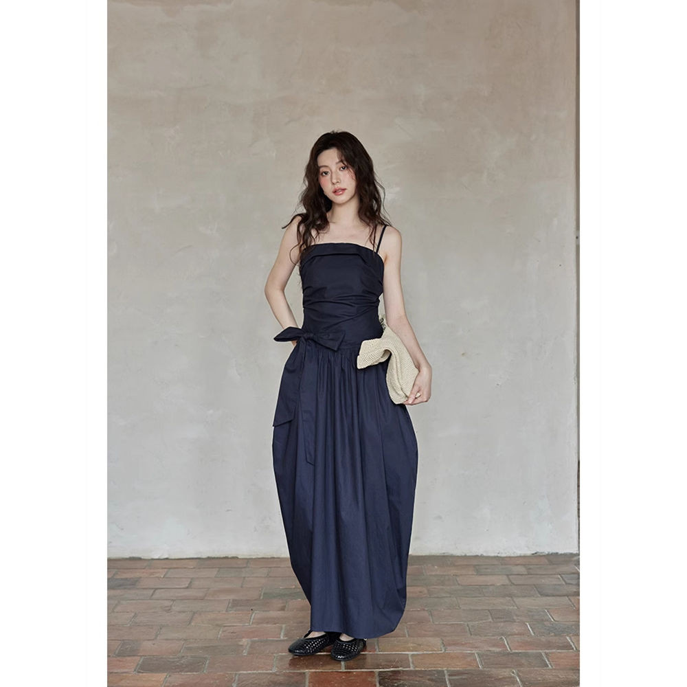 Shanmieleng ชุดกระโปรงยาวแบบslimmer สไตล์เรโทรฝรั่งเศส สีฟ้าสำหรับฤดูร้อน