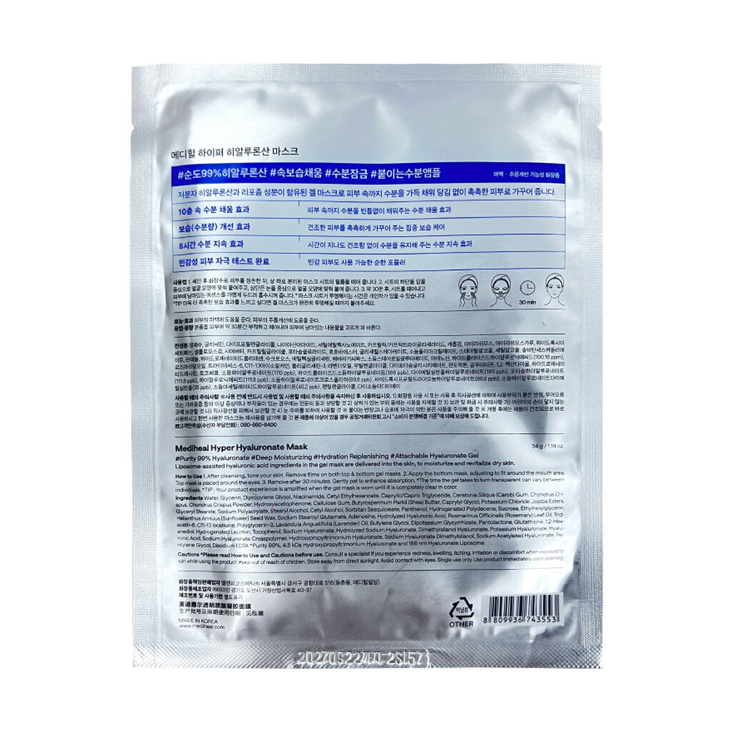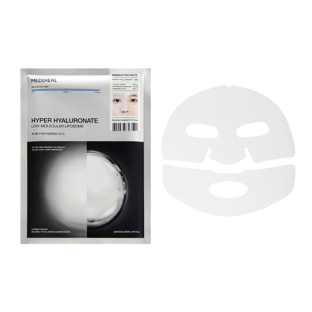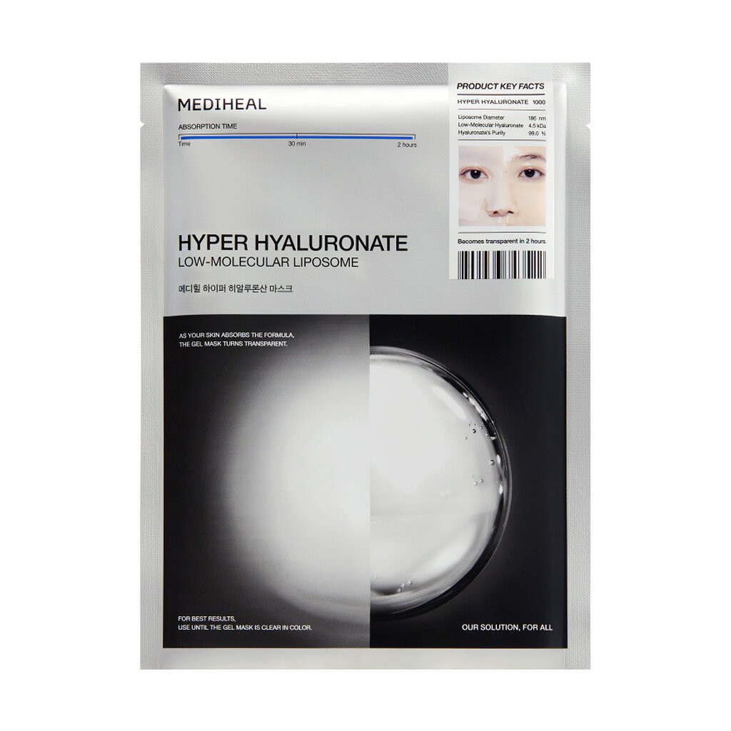 เมดิฮีล ไฮเปอร์ ไฮยาลูโรเนต มาสก์ แผ่นมาส์กสูตรมอยส์เจอร์เจลที่ออกแบบมาเพื่อเติมเต็มความชุ่มชื้นให้กับผิวได้ในขั้นตอนเดียว ด้วยเทคโนโลยี Hyaluronic Acid Liposome ขนาดเล็กเพียง 186 นาโนเมตร (เล็กกว่ารูขุมขน) จึงสามารถซึมซาบเข้าสู่ผิวได้อย