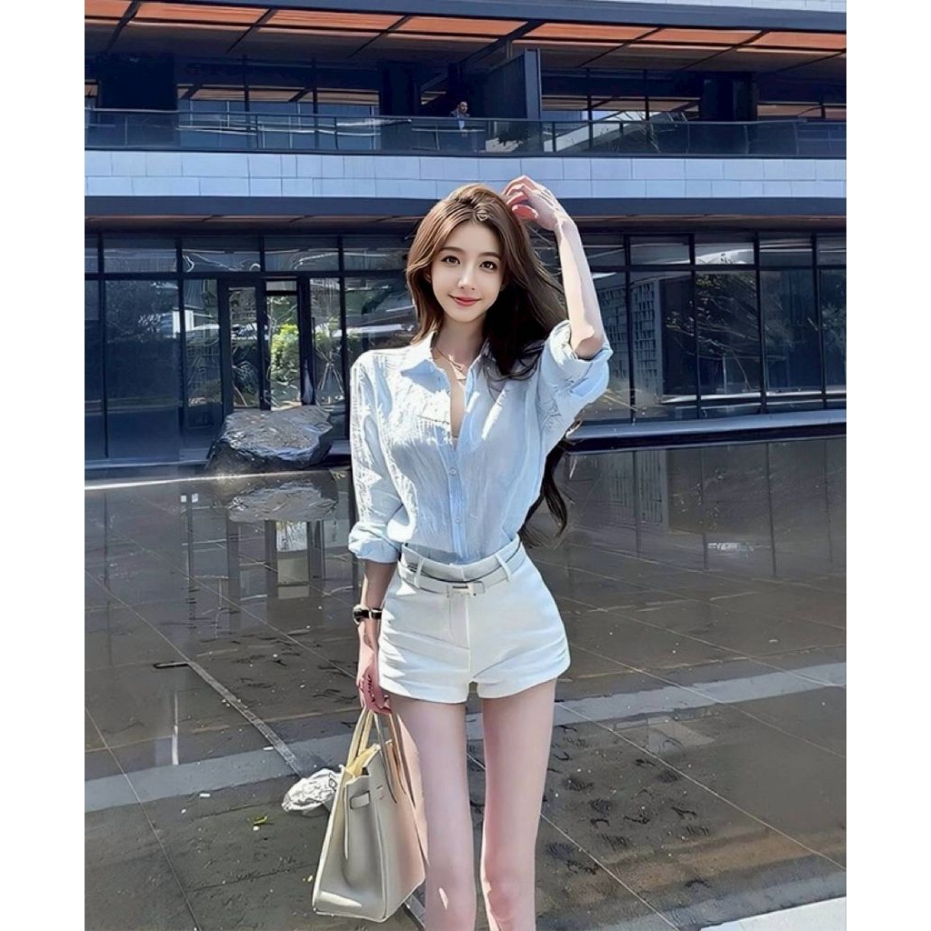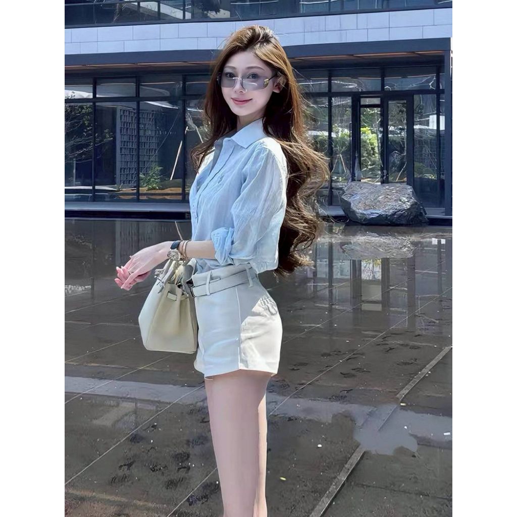 Detail : Set 3 ชิ้น เสื้อ+กางเกง+เข็มขัด เสื้อเชิ้ตแขนยาวสีฟ้า เนื้อผ้ามี texture ใส่สบาย มากับกางเกงเป็นทรงขาสั้นเอวสูงช่วยขับสรีระให้ขายาวขึ้น เสริมด้วยเข็มขัดที่แมตช์โทนสีเดียวกันทำให้ลุคดูสมาร์ทแล