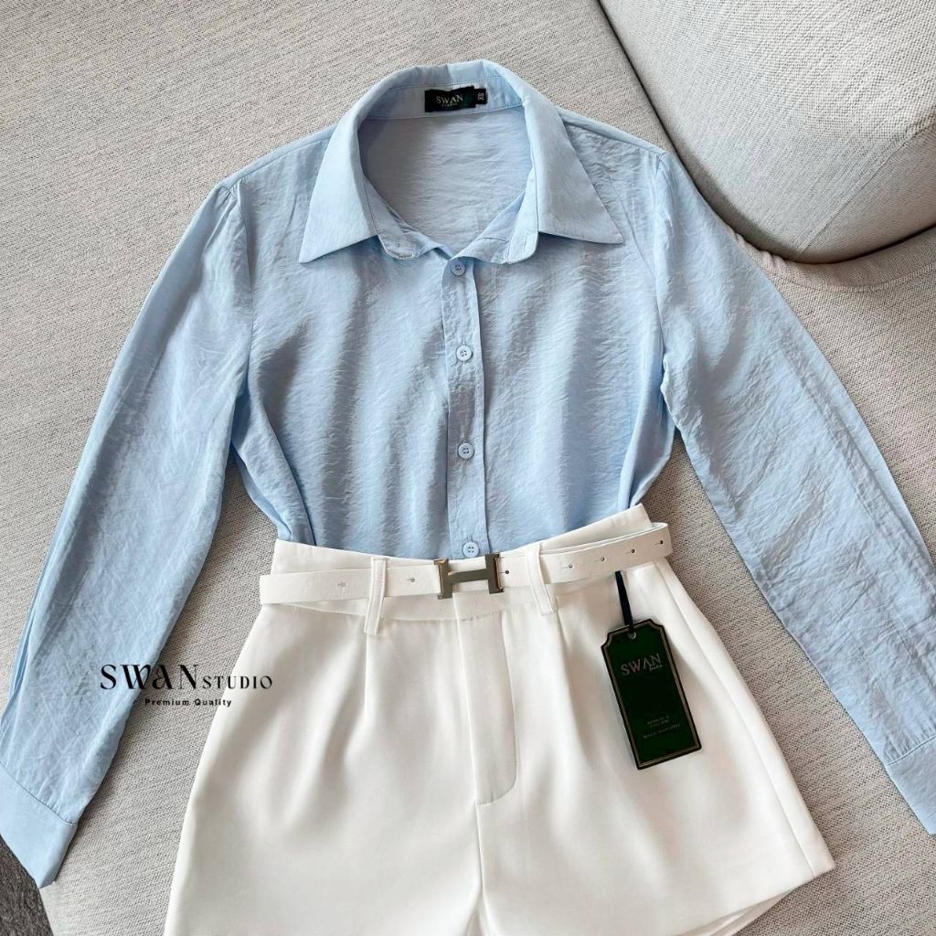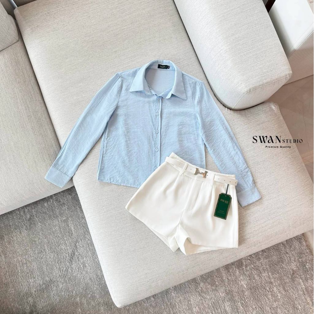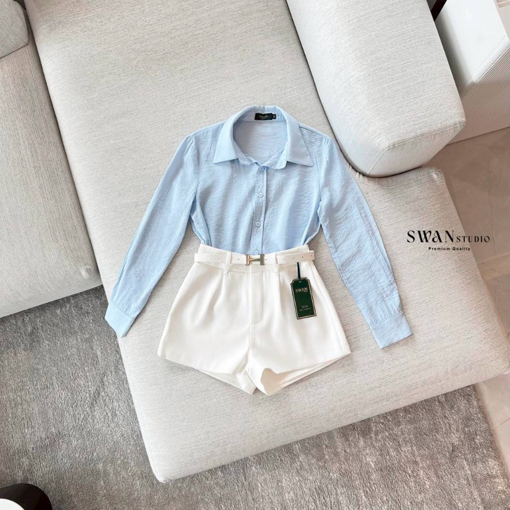 Swan Set 3 ชิ้น เสื้อ+กางเกง+เข็มขัด เสื้อเชิ้ตแขนยาวสีฟ้า เนื้อผ้ามี texture ใส่สบาย