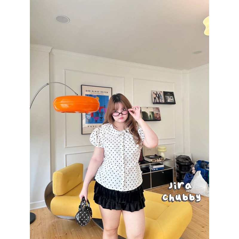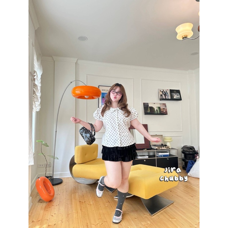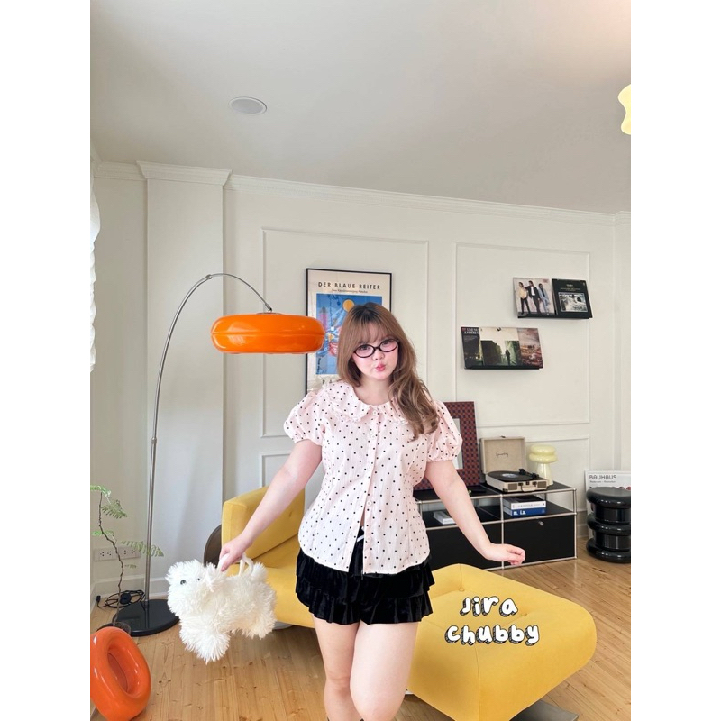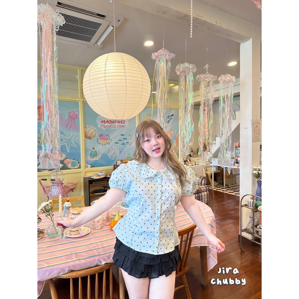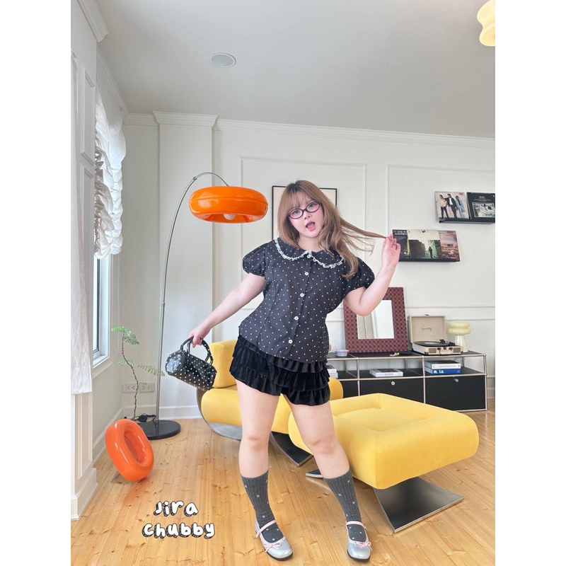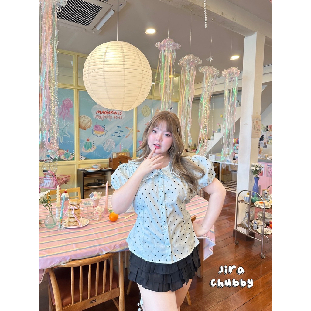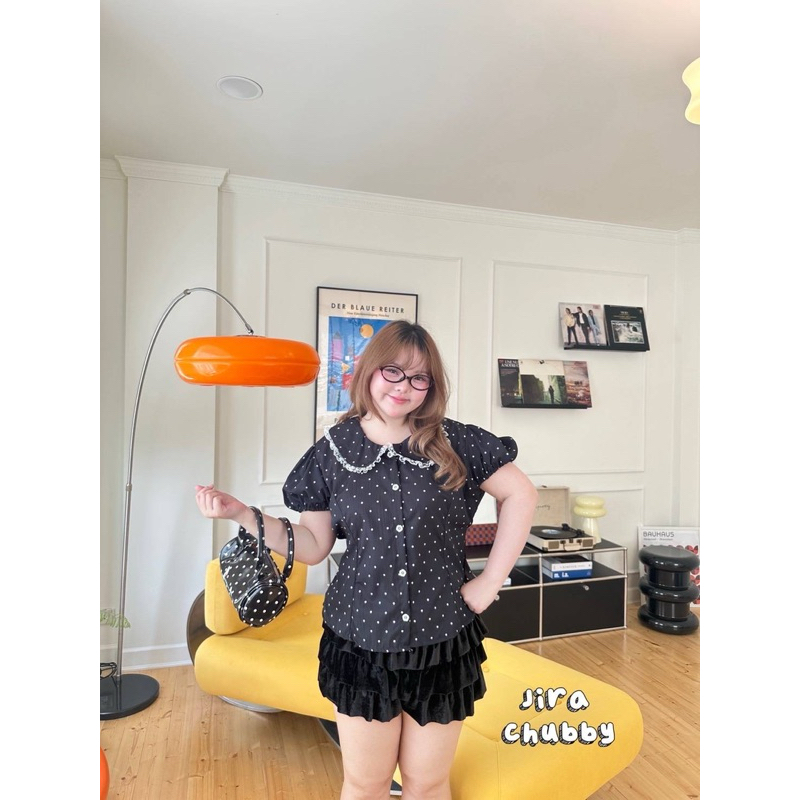 เสื้อลายจุดสุดฮิต ตัวปกเป็นทรงคอบัวแต่งลูกไม้
