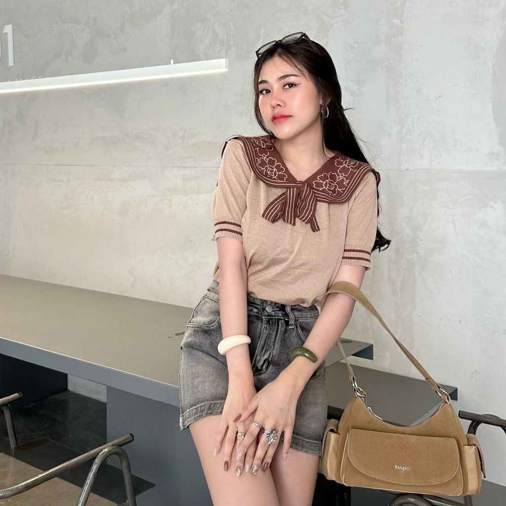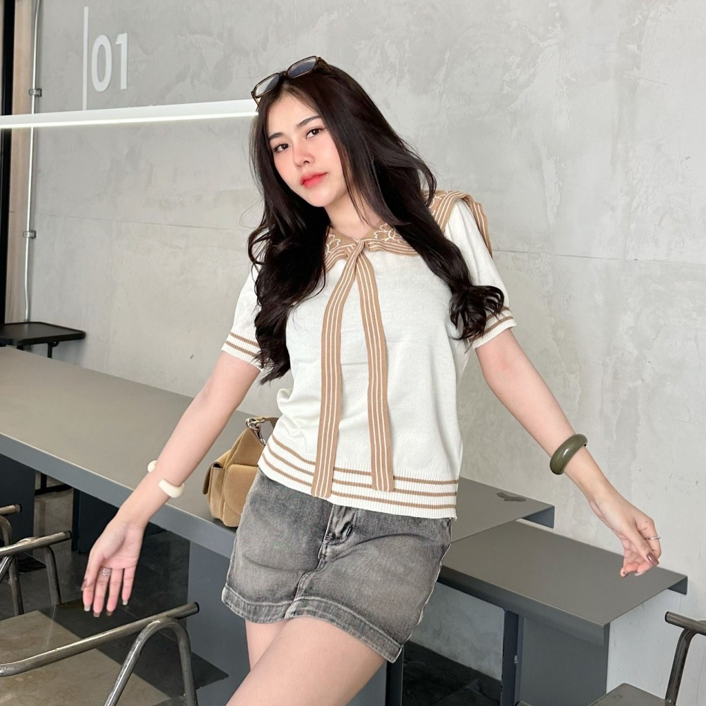 ?SpinnyHouse?เสื้อยืดคอกลม แต่งคอปก ทอลายแต่งช่วงปก เนื้อผ้าไหมพรมหนานุ่ม ใส่สบาย สาวอวบใส่ได้ เรียบหรูดูแพง รุ่น โยคะ