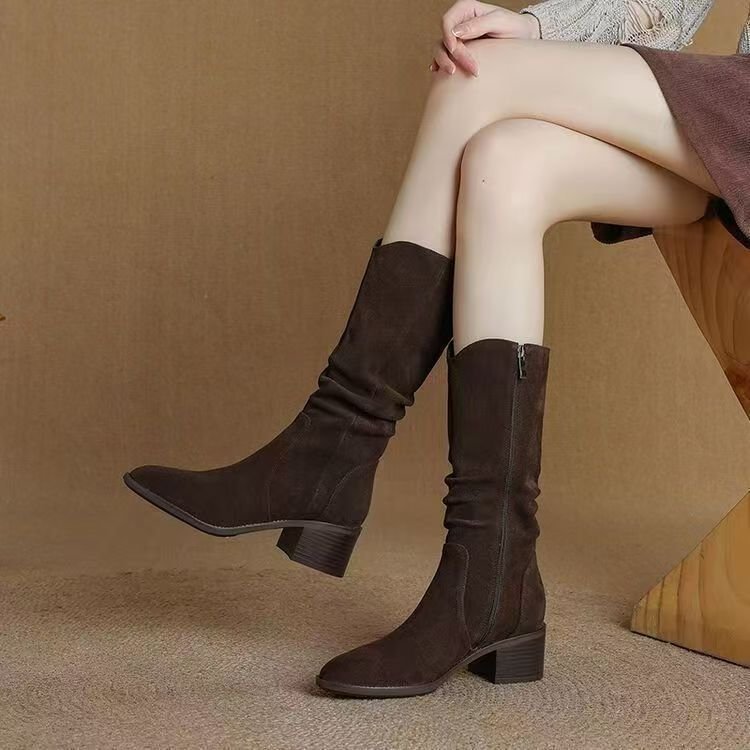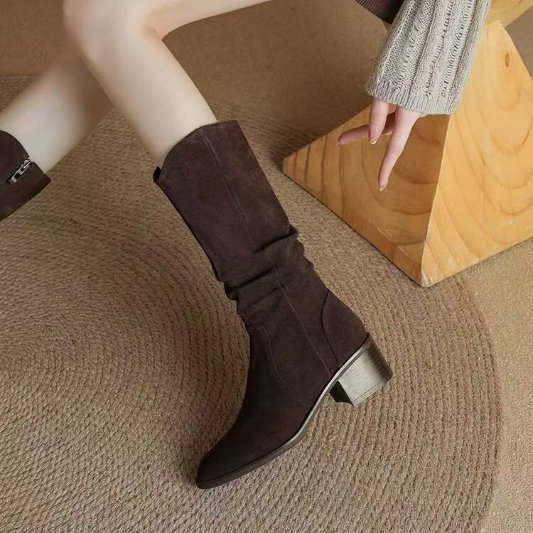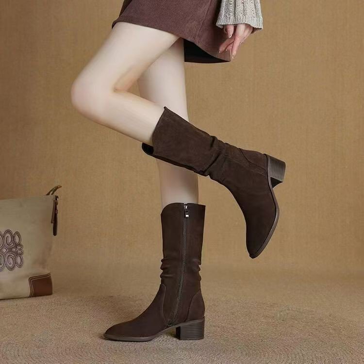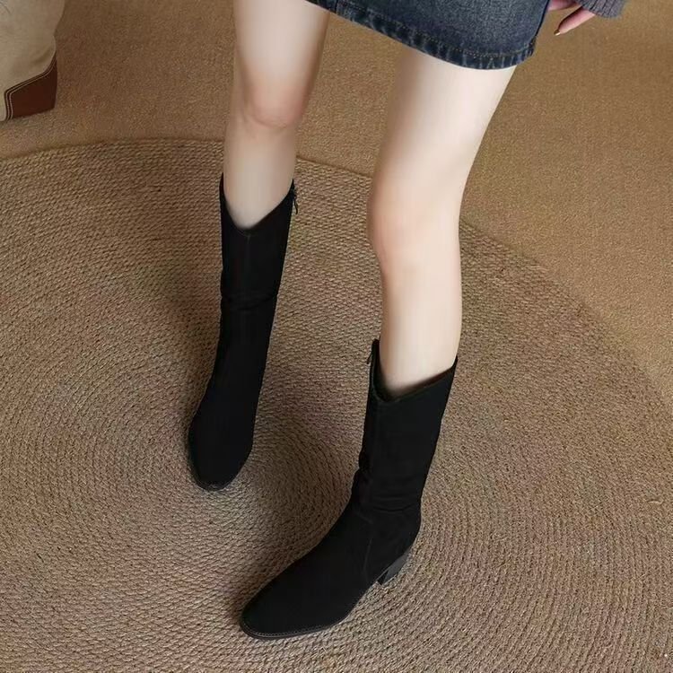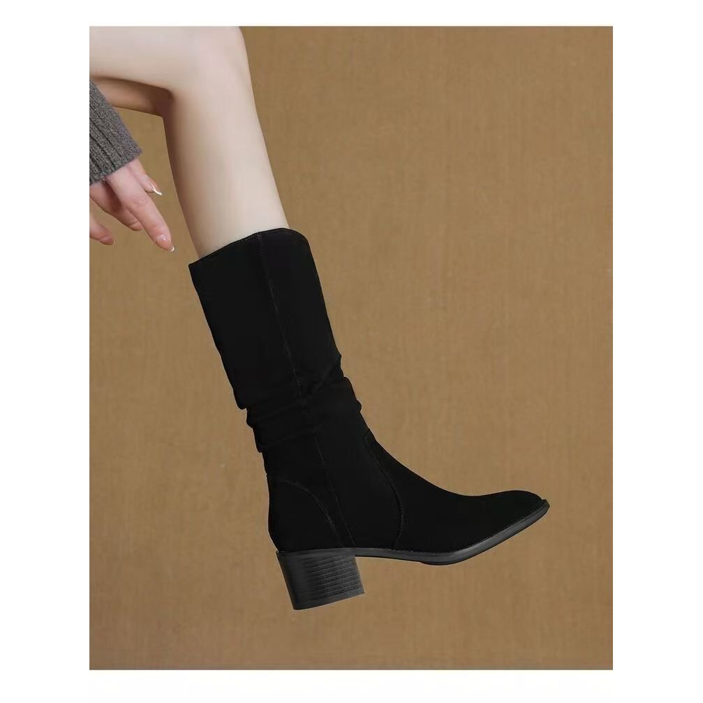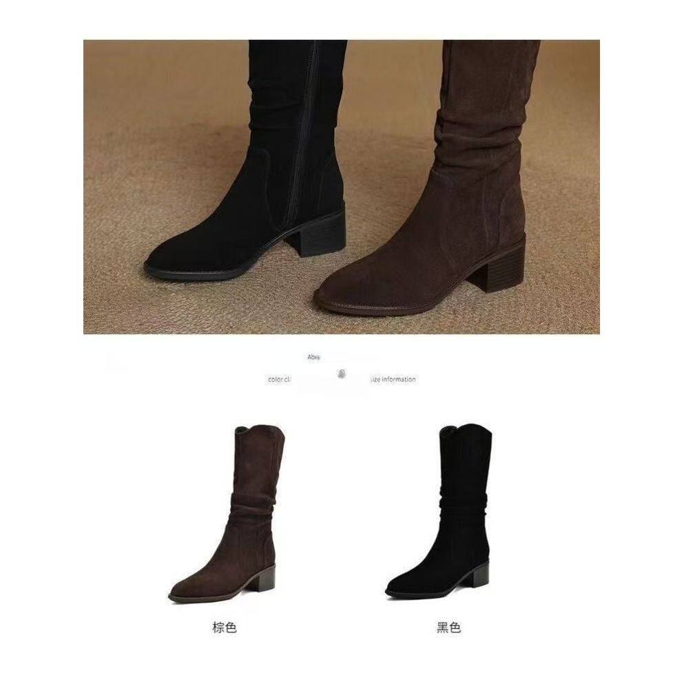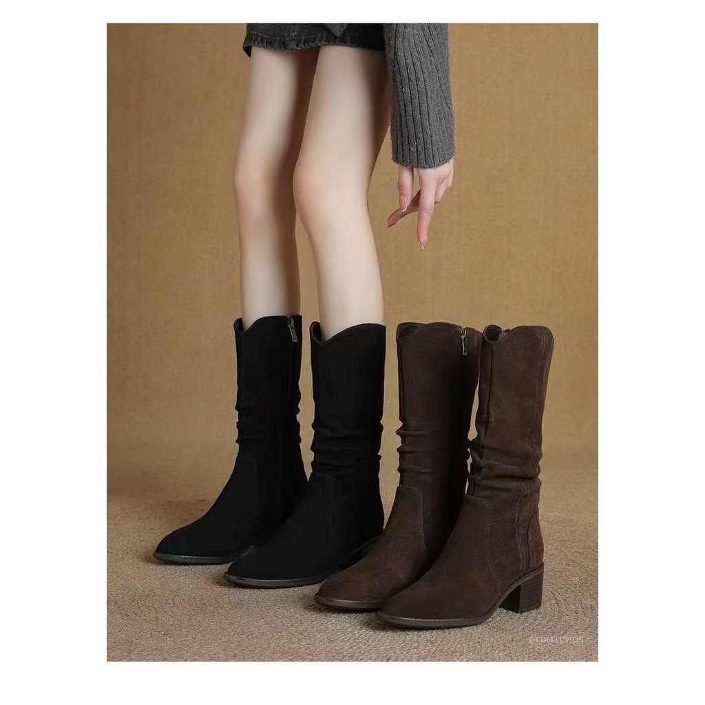 รองเท้าบูทสตรี ส้นหนา suede มีซิปรอบข้อเท้า สไตล์แฟชั่น