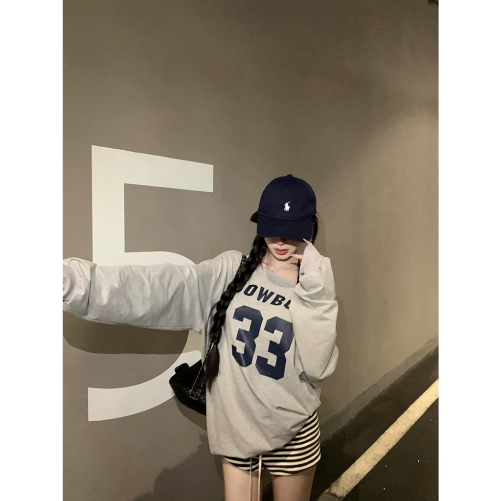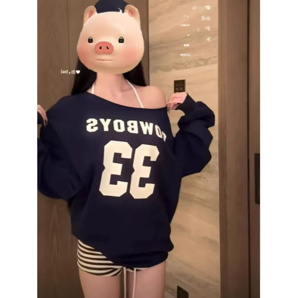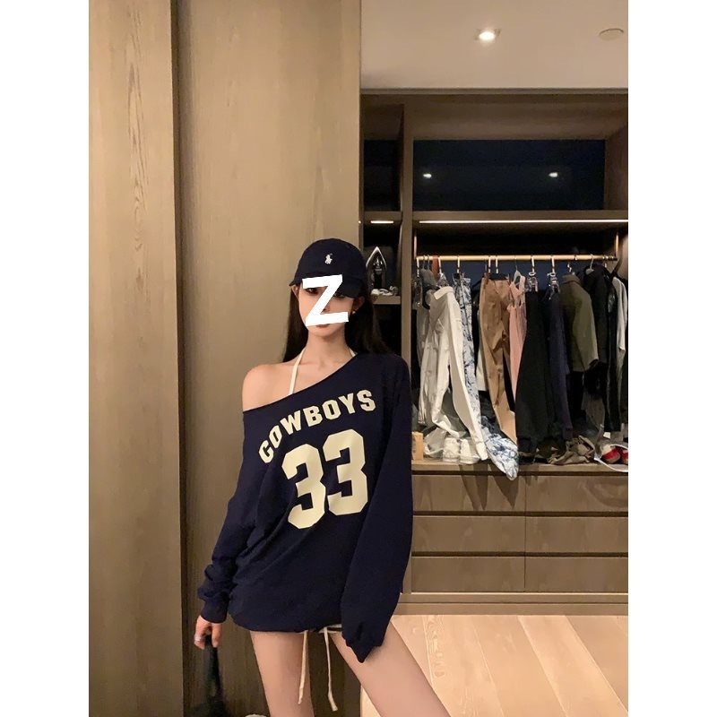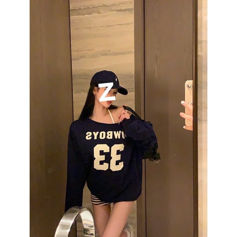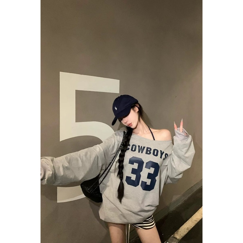 เสื้อแขนยาวผู้หญิง ปาดไหล่ พิมพ์ลาย ทรงหลวม ผ้ายืด ผ้าบางนิ่ม ใส่สบาย