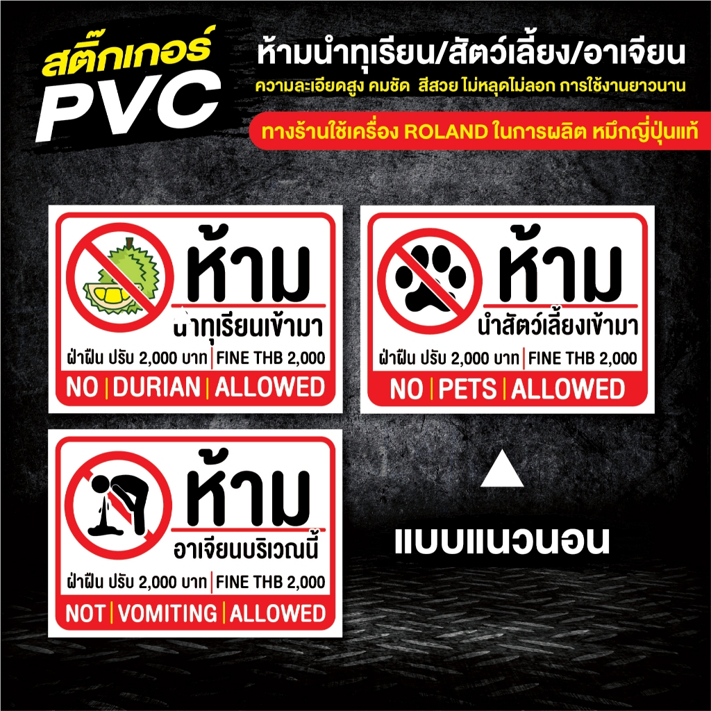 ? สติ๊กเกอร์ PVC ห้ามนำทุเรียน/ห้ามสัตว์เลี้ยง/ห้ามอาเจียน กันน้ำ กันแดด กันฝน ✔️