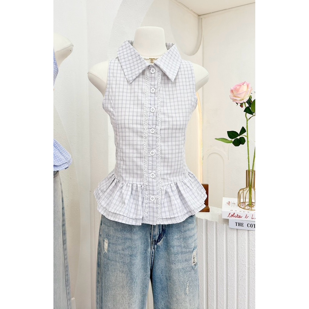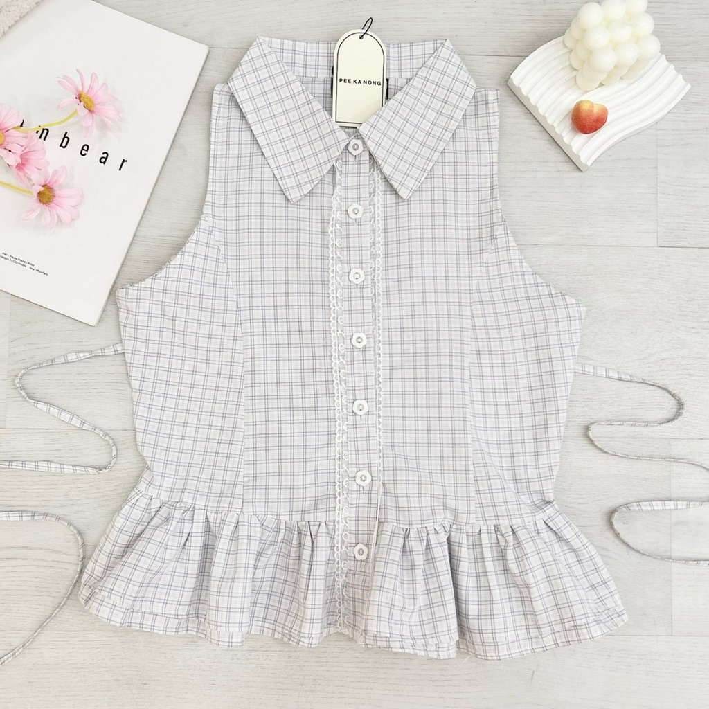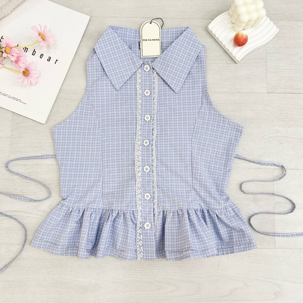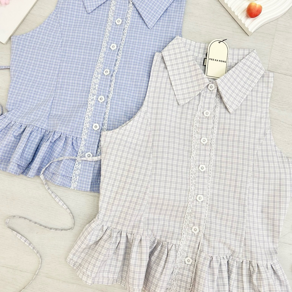 Detail : เสื้อคอปกแขนกุดลายสก็อต ดีเทลแต่งขอบลูกไม้กระดุม กระดุมแกะได้ มีเชือกผูกด้านหลัง เนื้อผ้าดีมากทรงสวย ดีเทลดีมากกก แมทง่าย ใส่น่ารักมากค่ะ