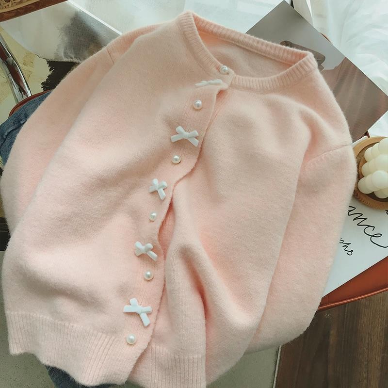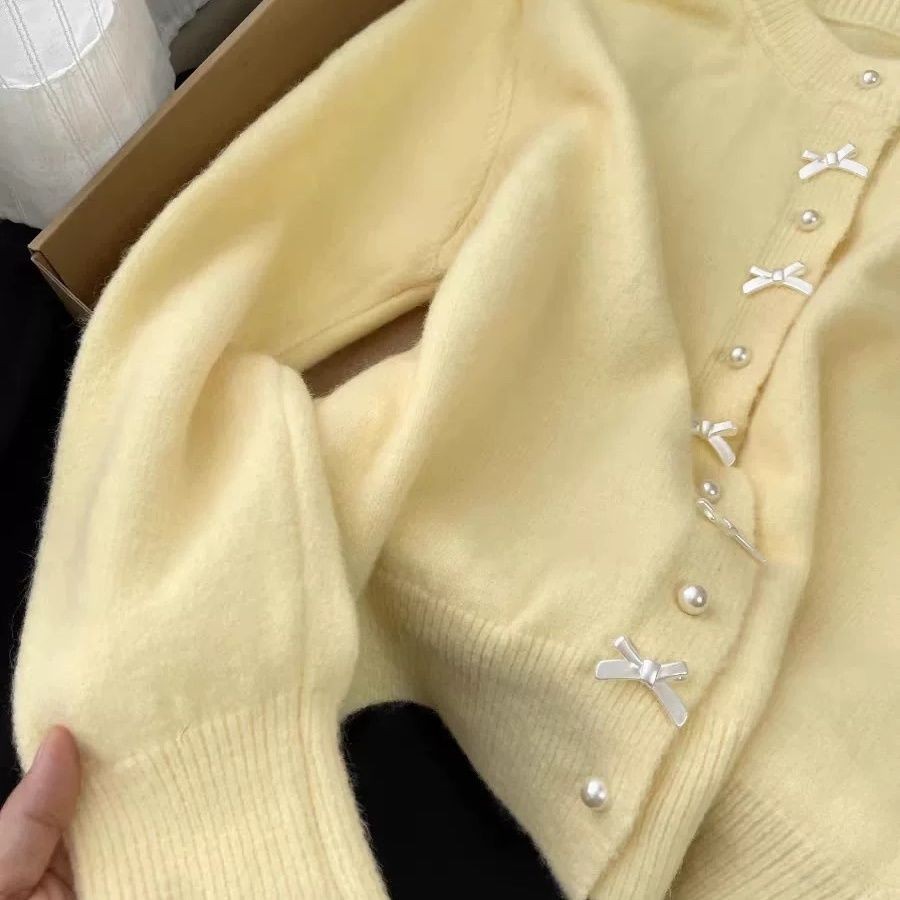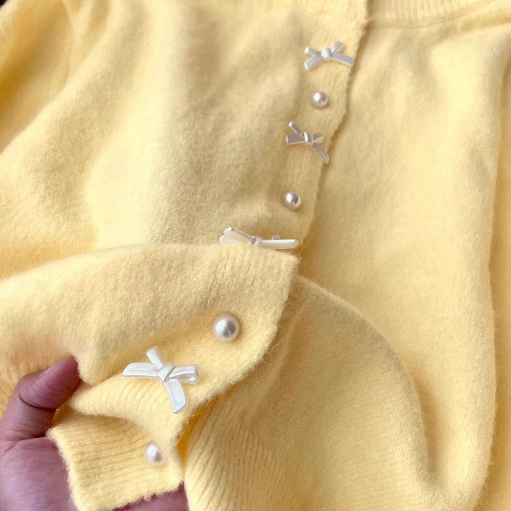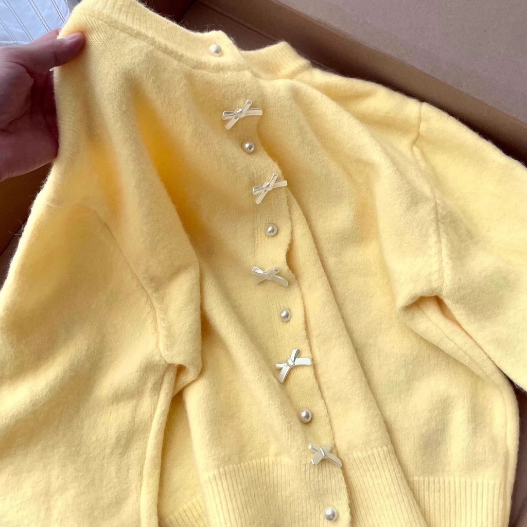 คาร์ดิแกนสีเหลืองครีม ลายไม่ซ้ำ กับโบว์ด้านบนแบบสามมิติ เหมาะสำหรับต้นฤดูใบไม้ผลิและสวมใส่ได้อ่อนโยน