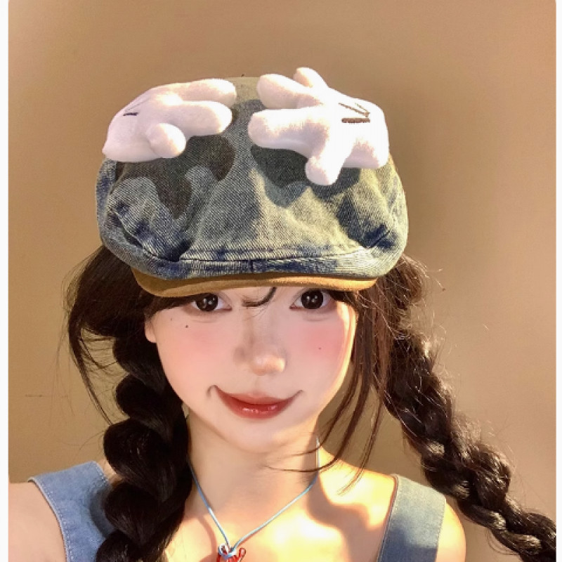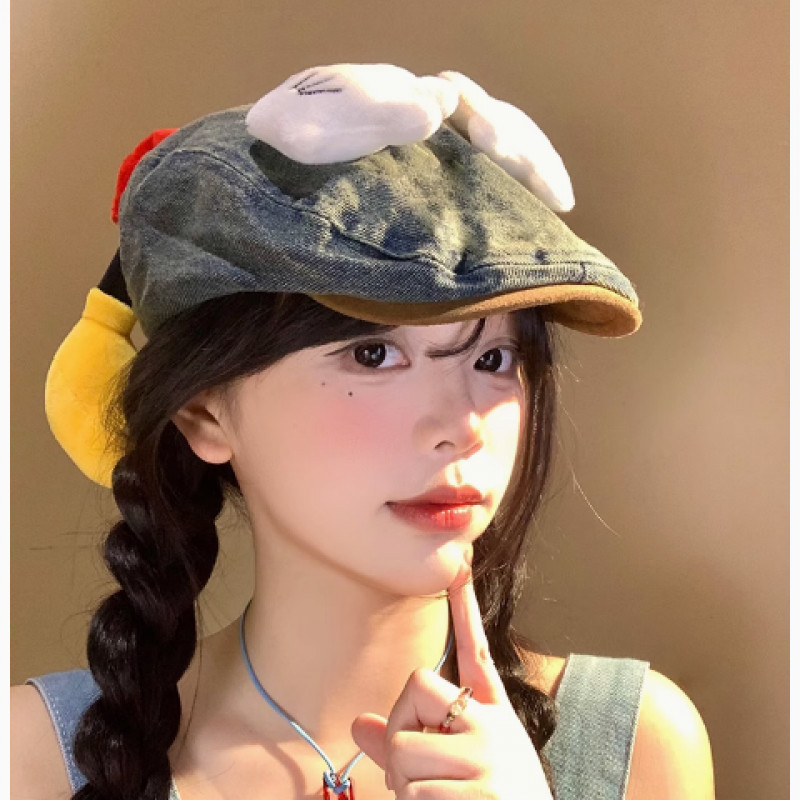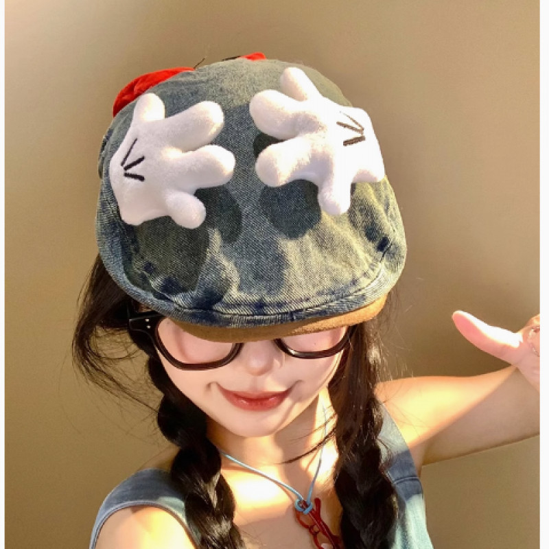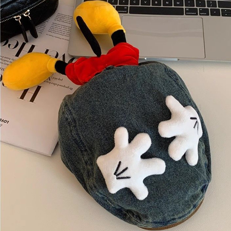 หมวกเบเร่ต์ผ้าเดนิมฟอกสีสำหรับผู้หญิง ลายการ์ตูนสุดน่ารัก มิกกี้ หมวกเบเร่ต์สำหรับผู้หญิง ขนาดใหญ่ ปรับขนาดได้ ลดความอ้วน หมวกอเนกประสงค์