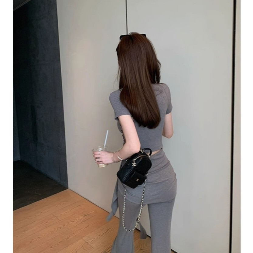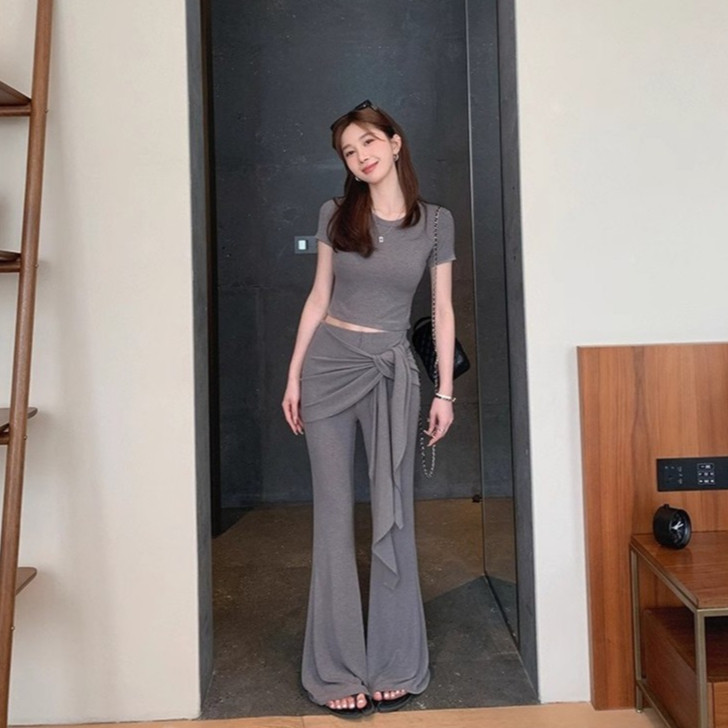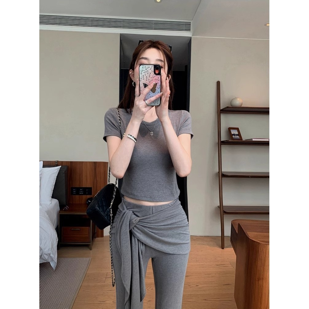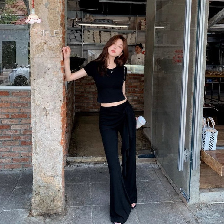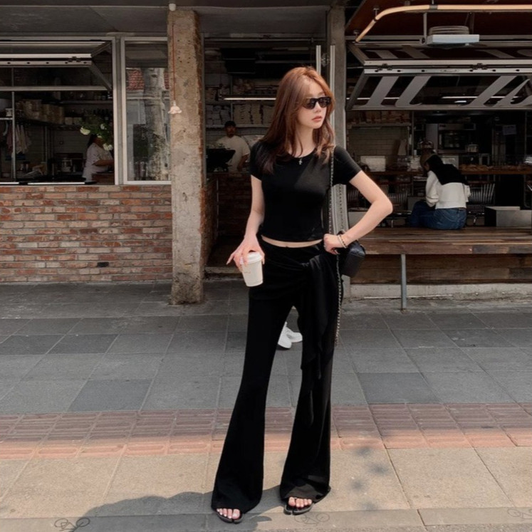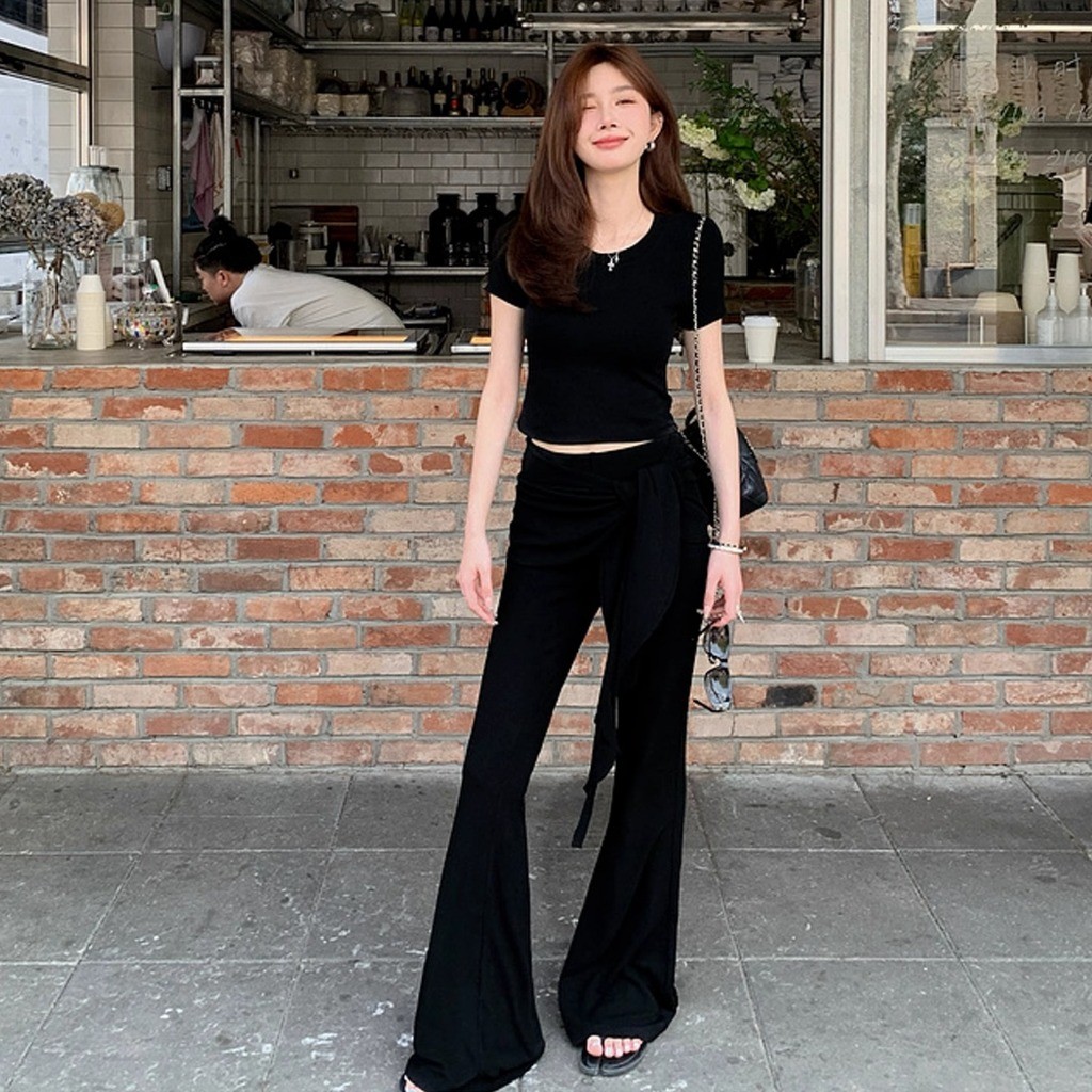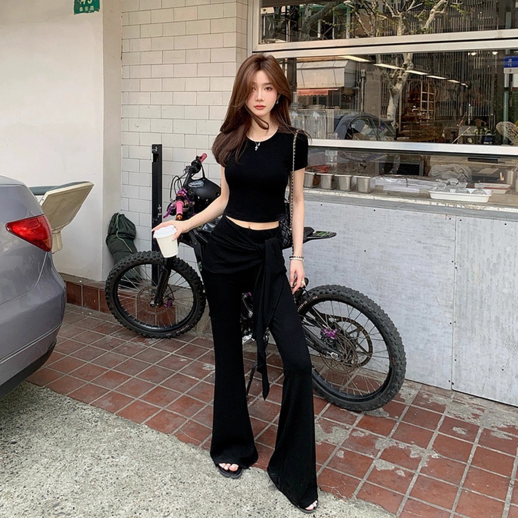 เสื้อครอปแขนสั้น สีดำ คอกลม กางเกงเอวยางยืดขาม้า แต่งชายผ้ายาวพันรอบเอว ผ้าโพลิเอสเตอร์ เซ็ต2ชิ้น #2101
