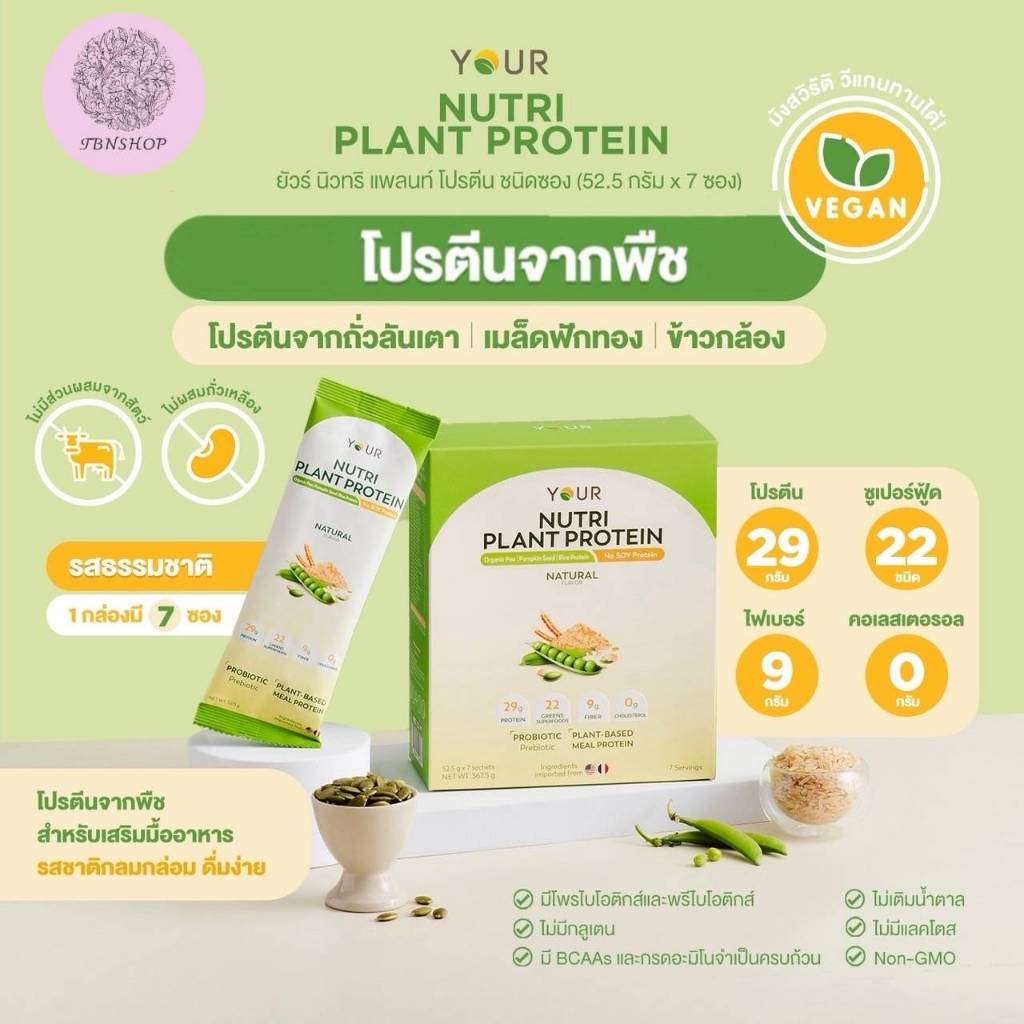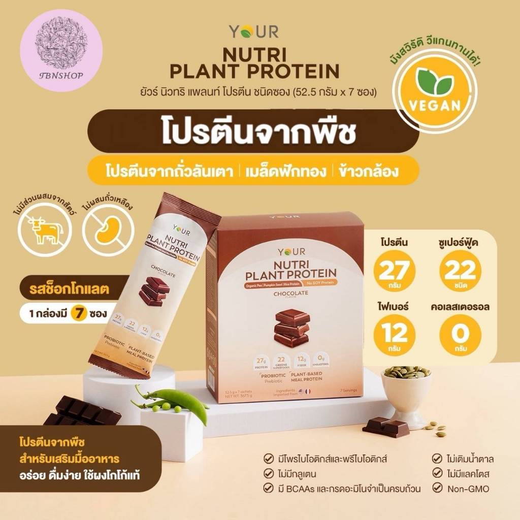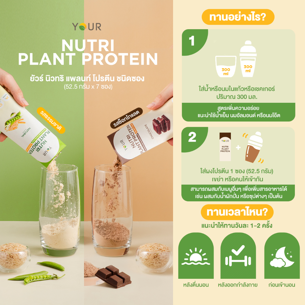 ? YOUR Nutri Plant Protein Sachet' ยัวร์ นิวทริ แพลนท์ โปรตีน แบบซองรสช็อกโกแลต และ รสธรรมชาติ นาด 52.5 กรัม บรรจุ 7 ซอง ใน 1 กล่อง ?