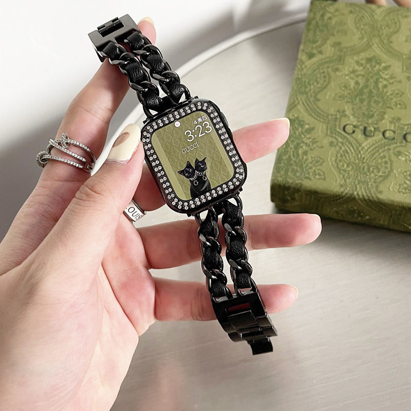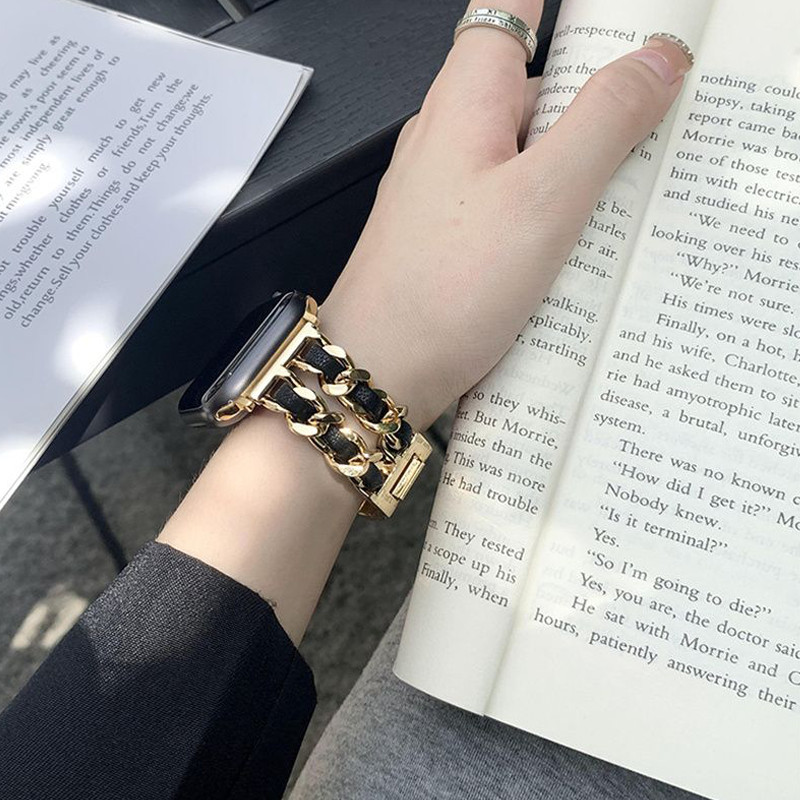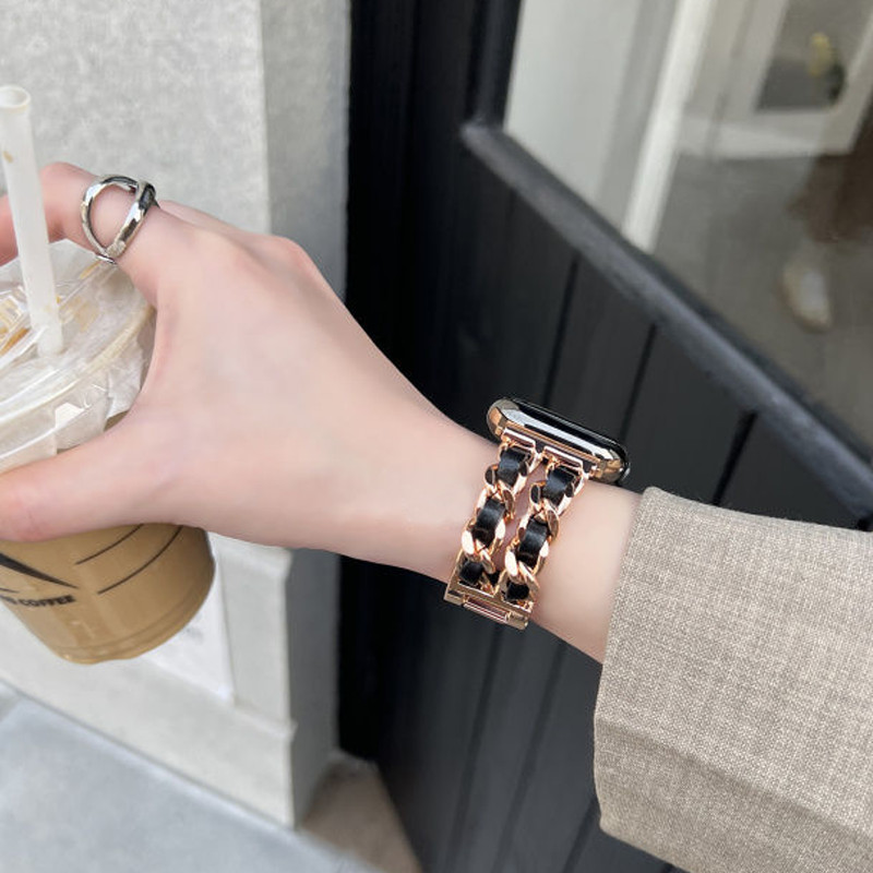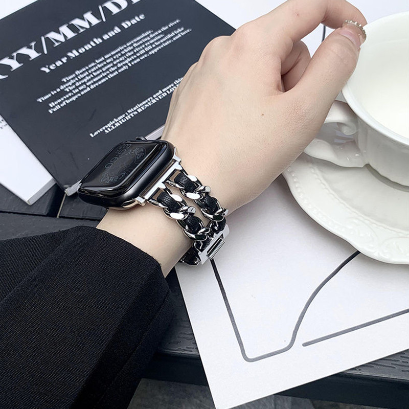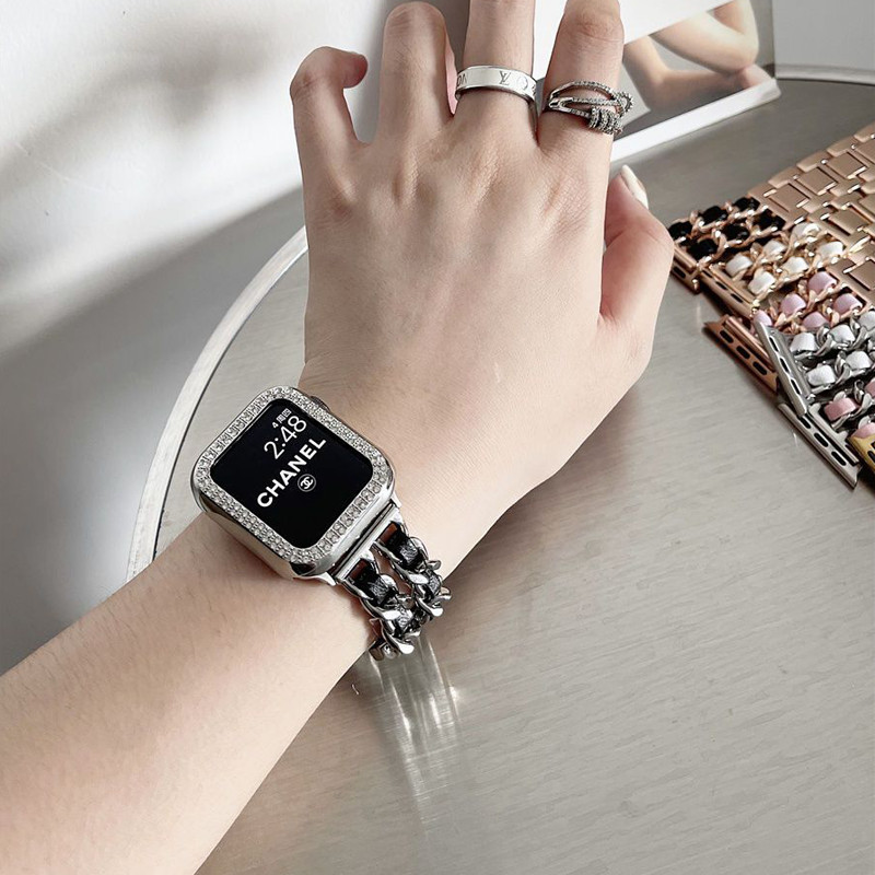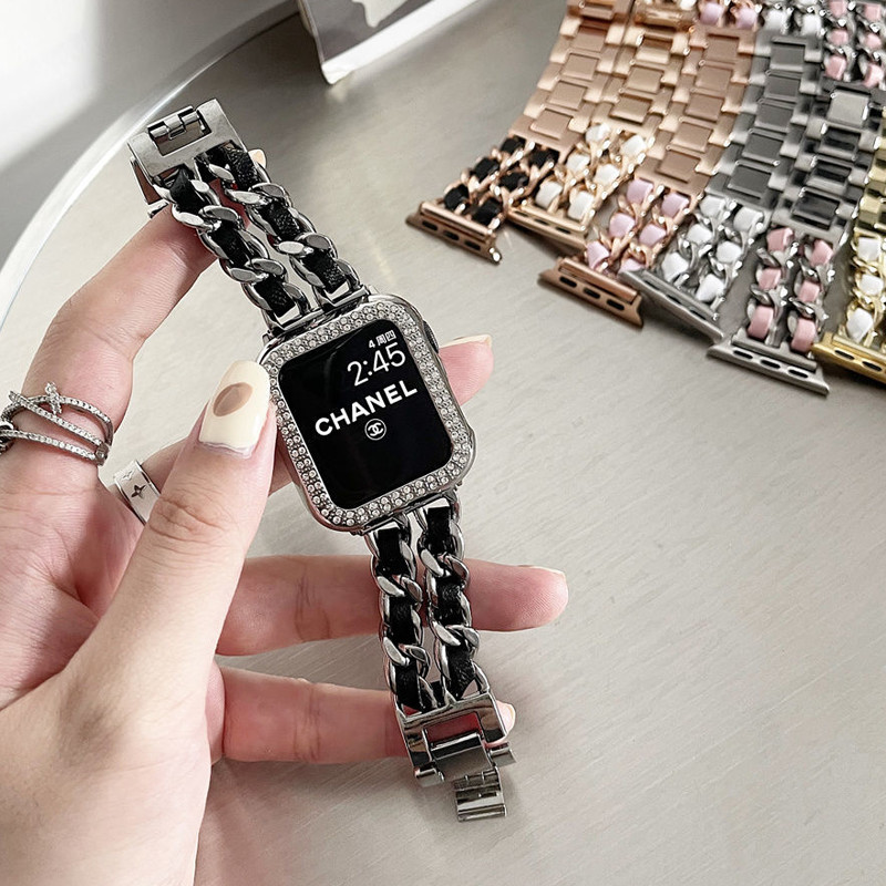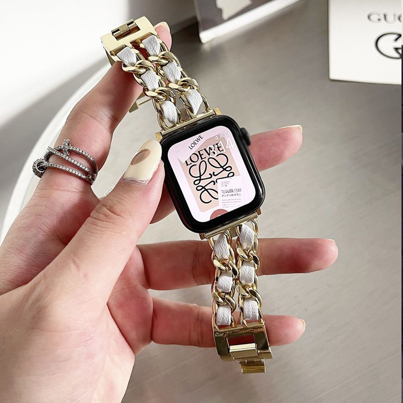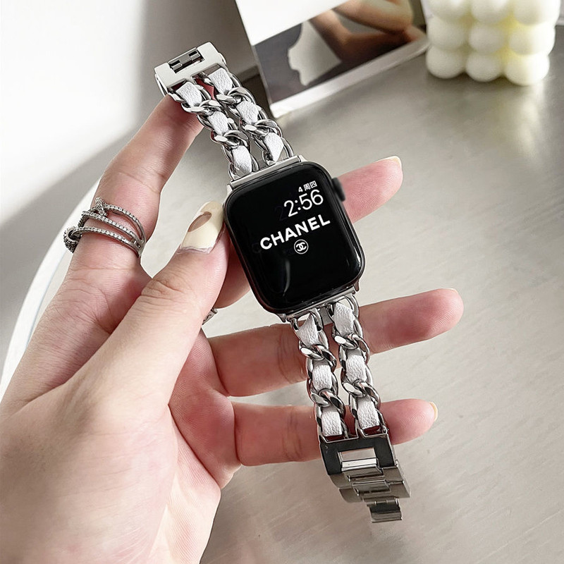 สายโซ่สไตล์ Chanel สำหรับ iwatch Ultra 49mm46mm สายโลหะสีเข้ากัน S11 10 9 8 7 6 5 4 3 2 1 se 42mm44mm45mm40mm41mm38mm