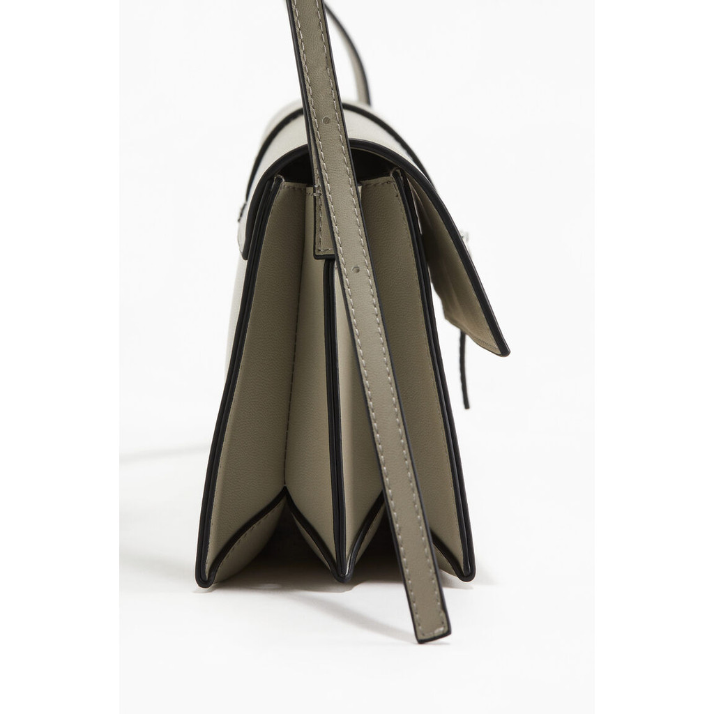 กระเป๋าสะพายไหล่ทำจากผ้าผิวเคลือบ พร้อมสายสะพายปรับได้ ฝาปิดแบบมีกระดุมแม่เหล็กซ่อนอยู่และสายตกแต่งที่มีหัวเข็มขัดด้านหน้า ภายในบุอย่างดี