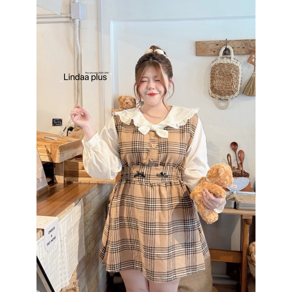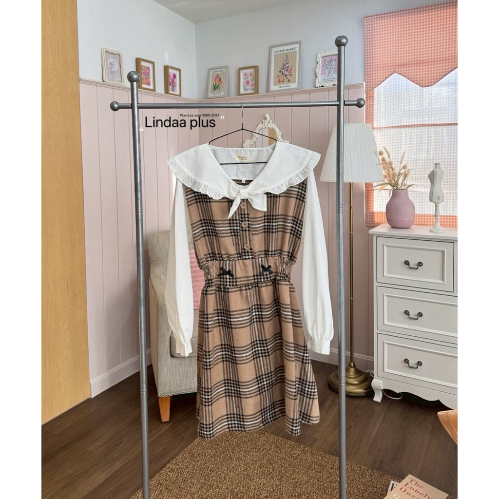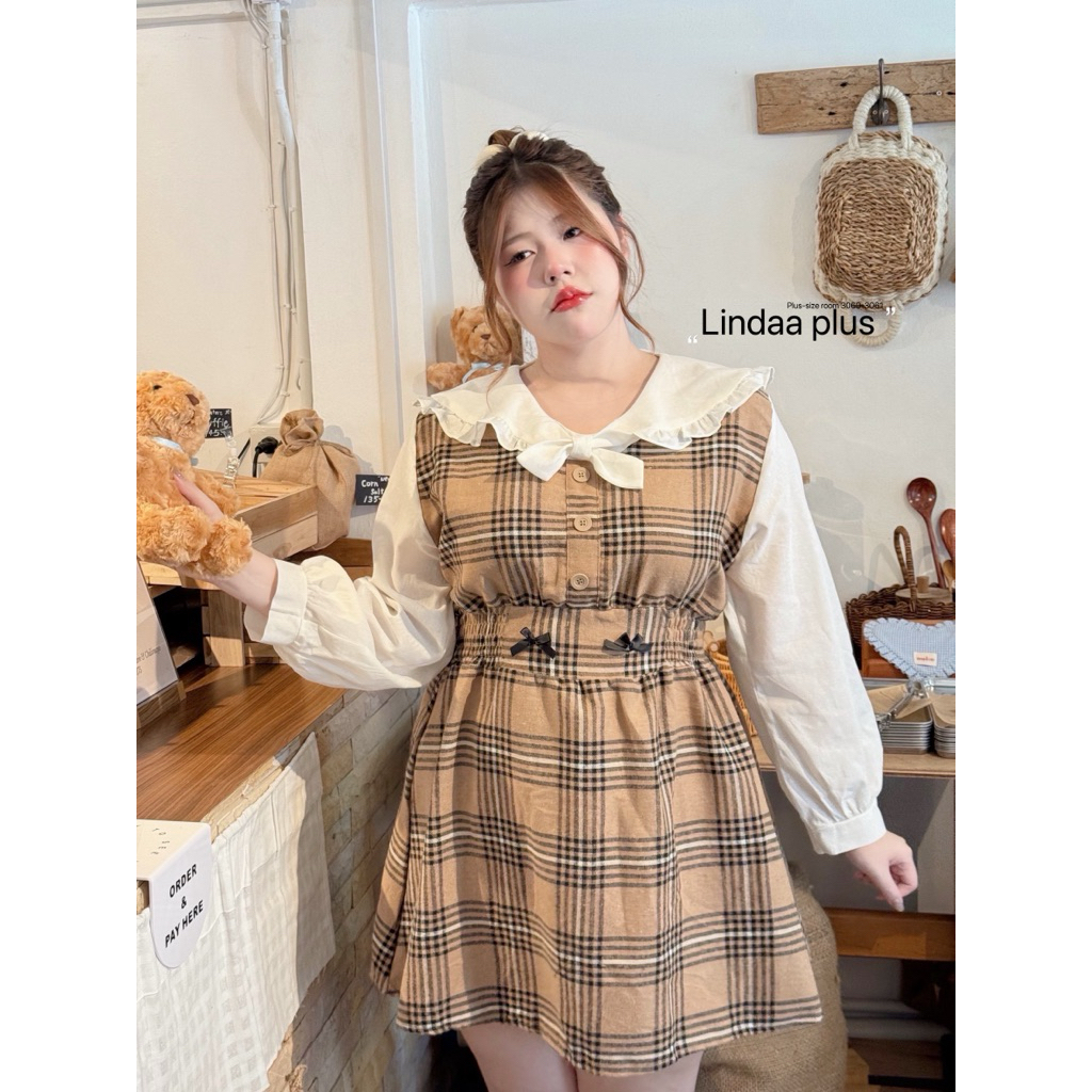 LD ชุดเดรสคอบัวสุดน่ารัก?? ผ้าคอตตอนเนื้อดี ลายสก๊อตเนื้อดี ติดโบว์ ไซส์ใหญ่ สาวอวบ