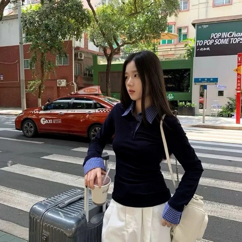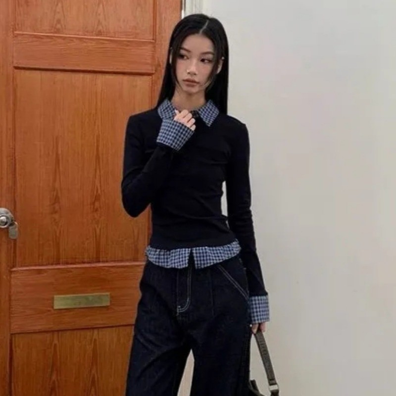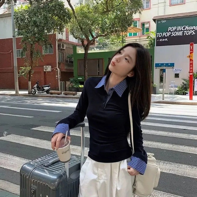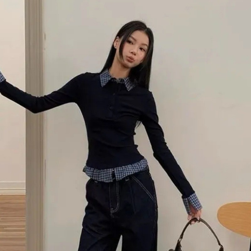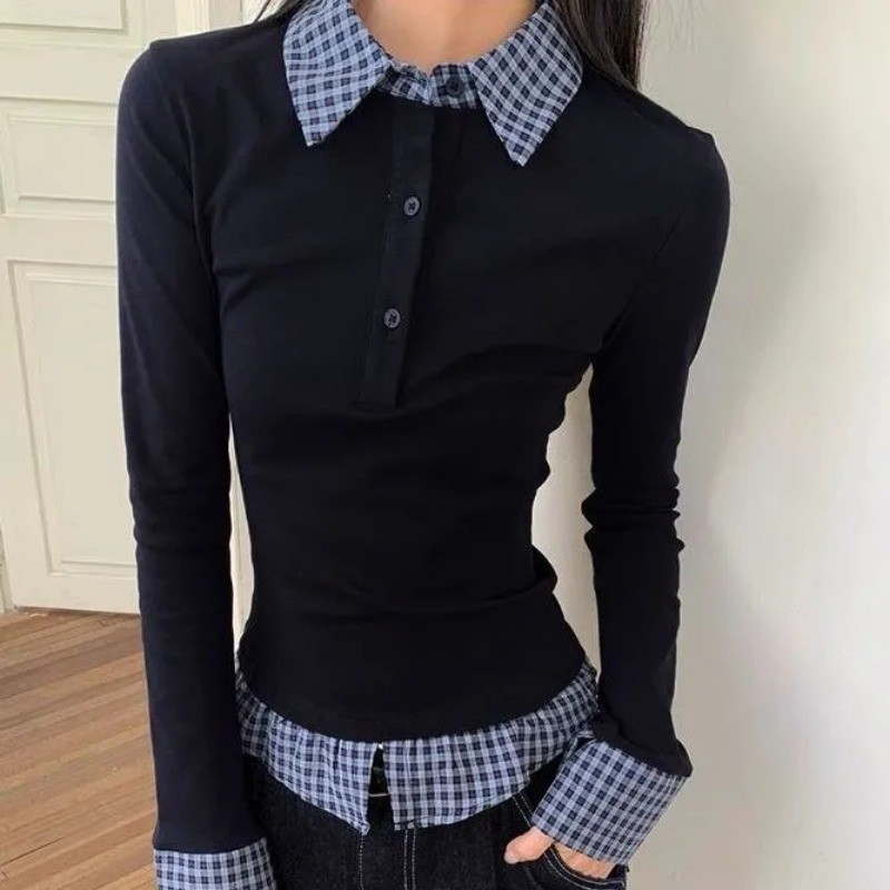 เสื้อโปโลลายหมากรุกสองชิ้นปลอมเกาหลีสําหรับฤดูใบไม้ผลิฤดูใบไม้ร่วงของผู้หญิงลําลองแขนยาว การทําตัวให้ผอม สูงสุด