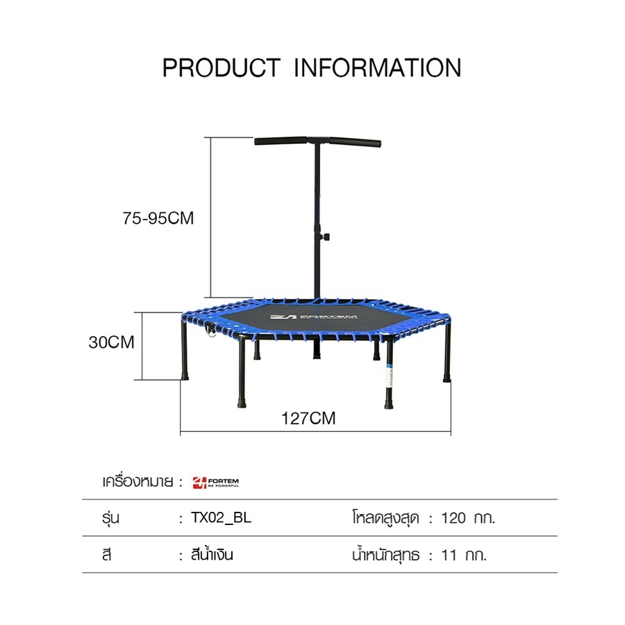 เครื่องเล่นออกกำลังกายแบบกระโดด ที่ช่วยเสริมสร้างกล้ามเนื้อ ช่วยเผาผลาญไขมันส่วนเกินได้ดี ให้คุณเพลิดเพลินและสนุกสนานในการออกกำลังกาย แทรมโพลีนมาพร้อมที่จับทำให้ไม่ต้องกังวลเรื่องกา
