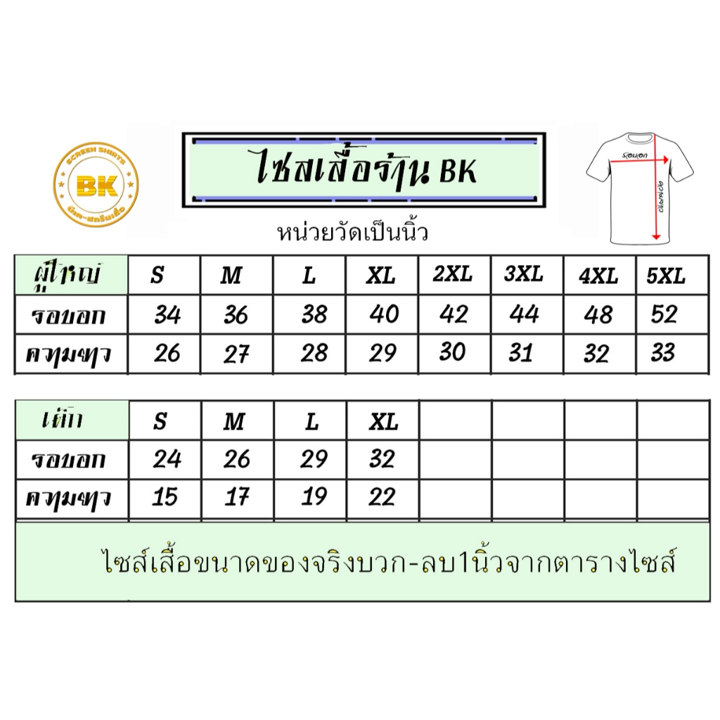 ไซส์ผู้ใหญ่ : S, M, L, XL, 2XL, 3XL, 4XL, 5XL