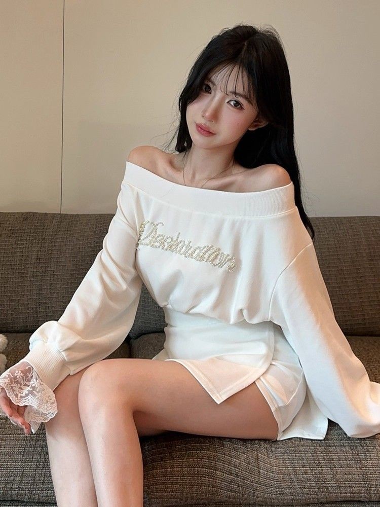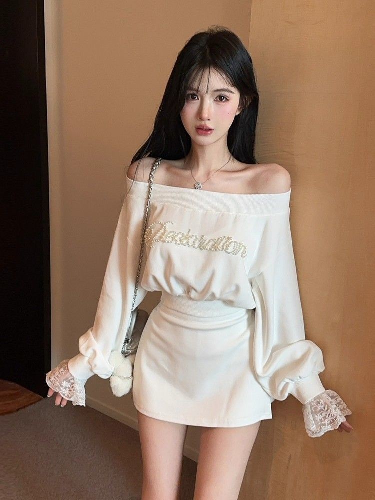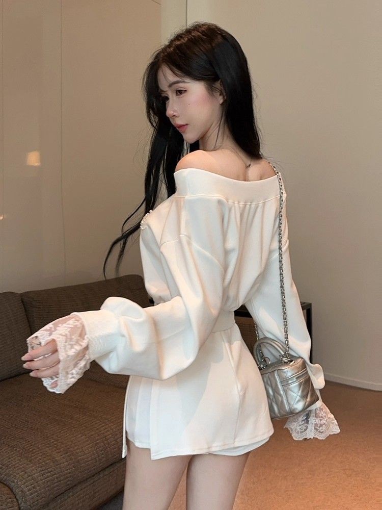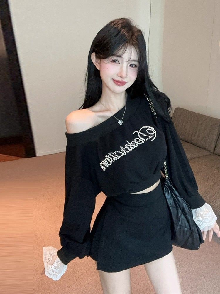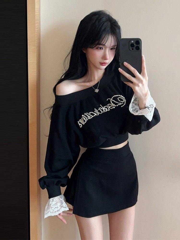 ชุดคู่ไหล่ตกแต่งลูกไม้ แขนยาว กันหนาวสั้นสีดำ และกระโปรงเอวสูง